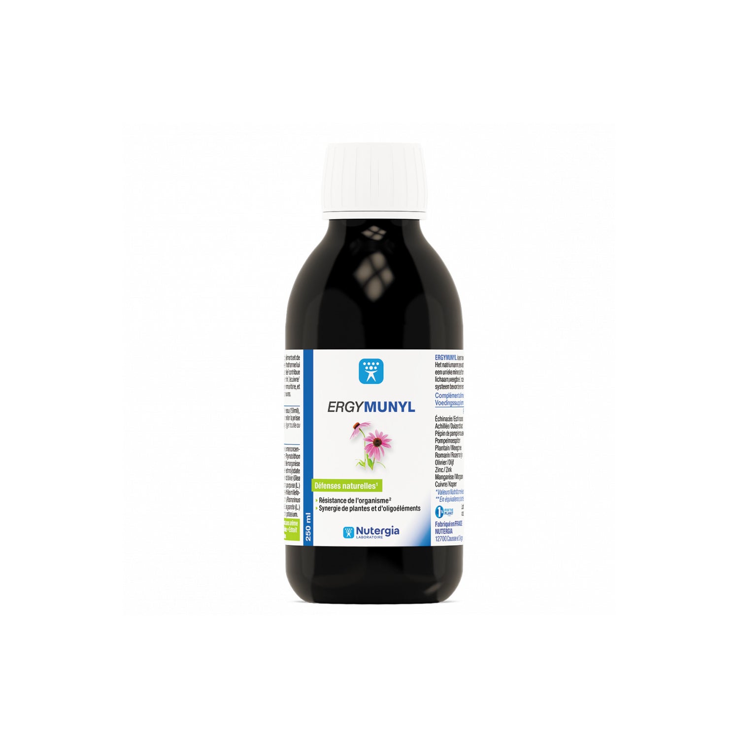 Nutergia Ergymunyl 250ml es un complemento alimenticio a base de plantas y oligoelementos que contribuyen a reforzar la inmunidad. La equinácea, el llantén y el romero ayudan a defender el organismo y se combinan con extracto de semilla de pomelo. La fórmula se completa con cobre y zinc para reforzar el sistema inmunitario. Además, el llantén, la equinácea, la milenrama y el olivo actúan sobre las vías respiratorias.No recomendado para niños, mujeres embarazadas o en período de lactancia, ni en caso de alergia a las Asteráceas.No contiene alcohol, azúcar, edulcorantes, aromas artificiales ni residuos de pesticidas.Fabricado en Francia.Los complementos alimenticios nunca deben sustituir a una alimentación sana, variada y equilibrada y a un estilo de vida saludable.