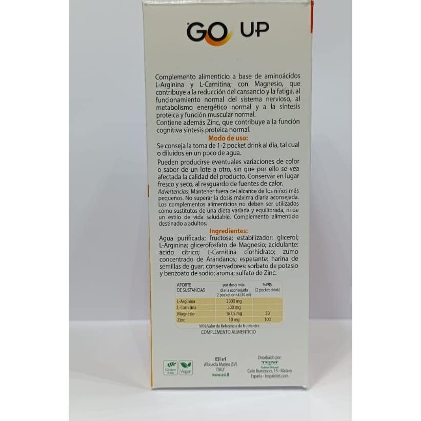 Esi Go-up Pocket Drink 16 Sobres es un complemento alimenticio formulado a base de magnesio, glicerofosfato, zinc y sulfato que está indicado para disminuir el cansancio y la fatiga que se produce durante la práctica deportiva.