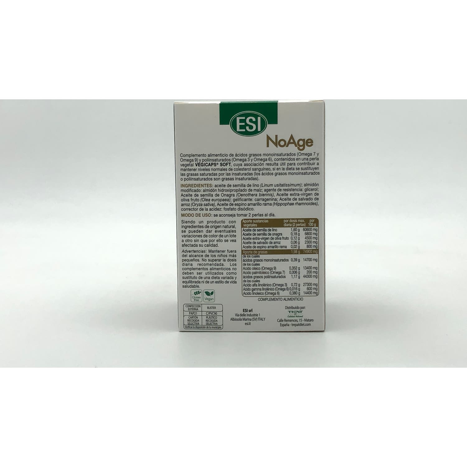 Las perlas NoAge de ESI es un complemento alimenticio recomendado como tratamiento coadyuvante en casos de vejez: pérdidas de memoria, reducción de arrugas o manchas y protección vascular y arterial. Elaborado con un alto contenido de Omega 3, 6, 7 y 9, ácidos grasos mono y pilinsaturados.