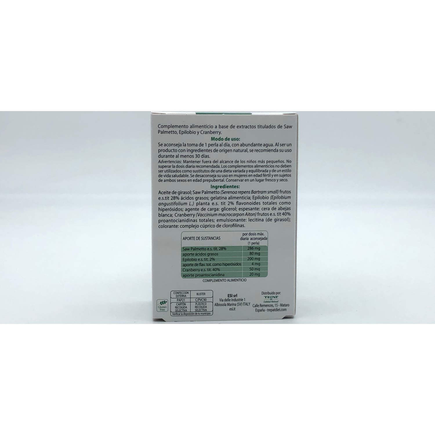 ESI Prosterbe 30 perlas es un complemento alimenticio que da soporte y mantiene el bienestar de la próstata. Formulado a base de epilobium, saw palmetto y arándano rojo (40% de proantocianidinas) que contribuyen a promover el bienestar del tracto urinario.