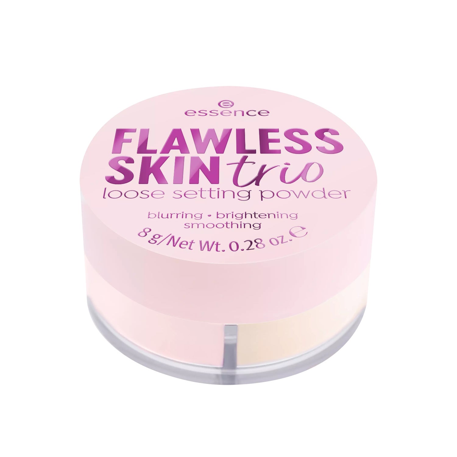 Essence Flawless Skin Trio Pó Solto de Fixação 8g es un producto diseñado para mejorar la corrección del color en el maquillaje. Este frasco contiene tres tipos de polvos sueltos, cada uno con una finalidad específica: