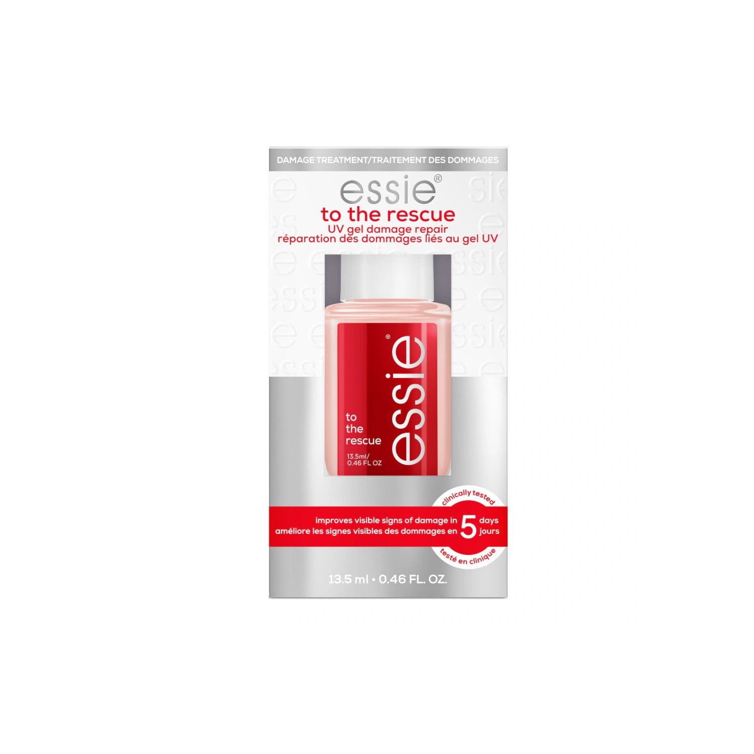 Essie To The Rescue Gel Reparador es un tratamiento diseñado para uñas dañadas que ha sido clínicamente probado para mejorar los signos visibles de daño ocasionado por el uso de gel UV en tan solo cinco días. Esta fórmula innovadora actúa sellando de inmediato la superficie de las uñas descamadas, brindando protección contra la rotura y mejorando la apariencia de las uñas delgadas.