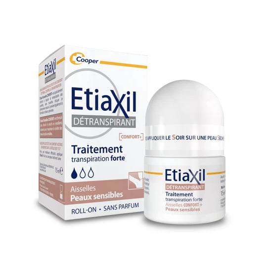Etiaxil Détranspirant Traitement Confort+ Peaux Sensibles 15ml es un tratamiento para la transpiración intensa que ayuda a regular la sudoración excesiva de las axilas.Este desodorante roll-on formulado con cloruro de aluminio ayuda a ralentizar la producción de sudor, poniendo en reposo las glándulas sudoríparas. El complejo protector CPx equilibra el pH de la piel y reduce el riesgo de irritación cutánea, al tiempo que limita la formación de olores de transpiración. Enriquecido con emolientes naturales, maximiza el confort de las pieles sensibles o delicadas.Formulado sin perfume ni alcohol, es compatible con el uso de un desodorante o perfume a diario.Eficacia clínicamente probada.