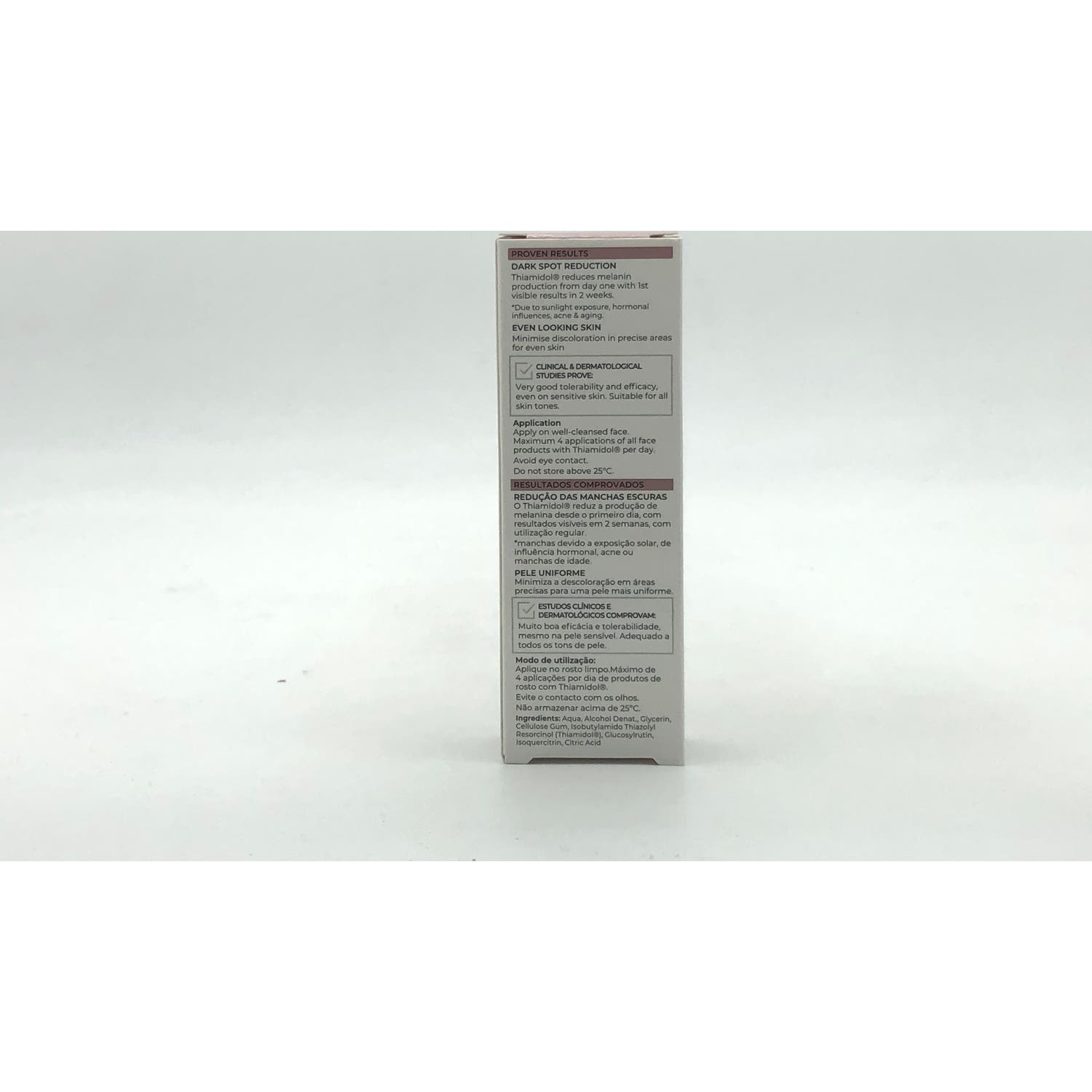 Aqua, Alcohol Denat, Glycerin, Cellulose Gum, Isobutylamido Thiazolyl Resorcinol (Thiamidol®), Glucosylrutin, Isoquercitrin, Citric Acid.