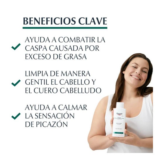 Eucerin® DermoCapillaire Champú Anticaspa 250ml es un champú que ayuda a reducir la aparición de caspa grasa en el cabello a la vez que regula el exceso de grasa y la dermatitis seborreica.