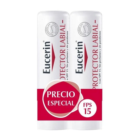 Eucerin Duplo Protector Labial SPF20 2x4,8g es un producto con pH5 que está pensado para proteger e hidratar los labios sensibles con sequedad y aspecto rugoso. Además, de proteger la piel de agentes externos como el frío, el calor, la contaminación y los factores ambientales no dañen la sensible piel de los labios.