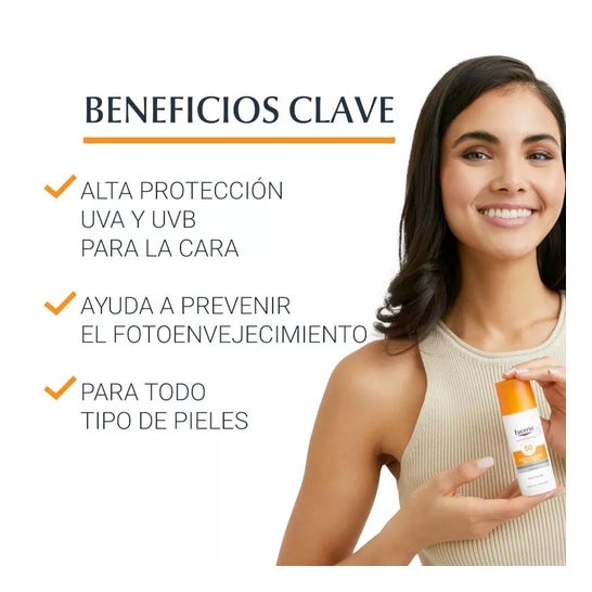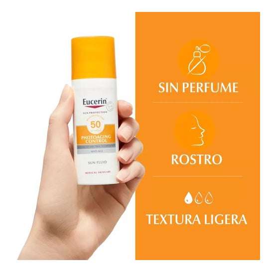 Eucerin Sun Fluid Photoaging Control SPF50+ 50ml es un protector solar facial que ayuda a prevenir el fotoenvejecimiento y reduce visiblemente las arrugas.
