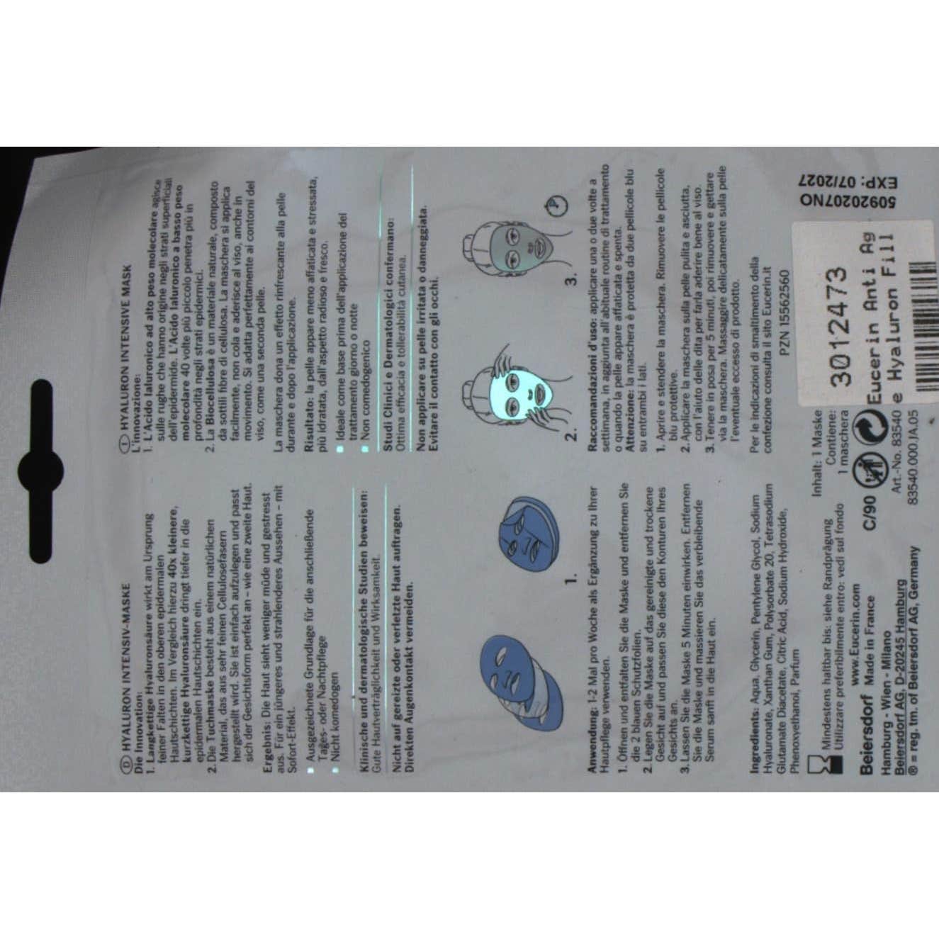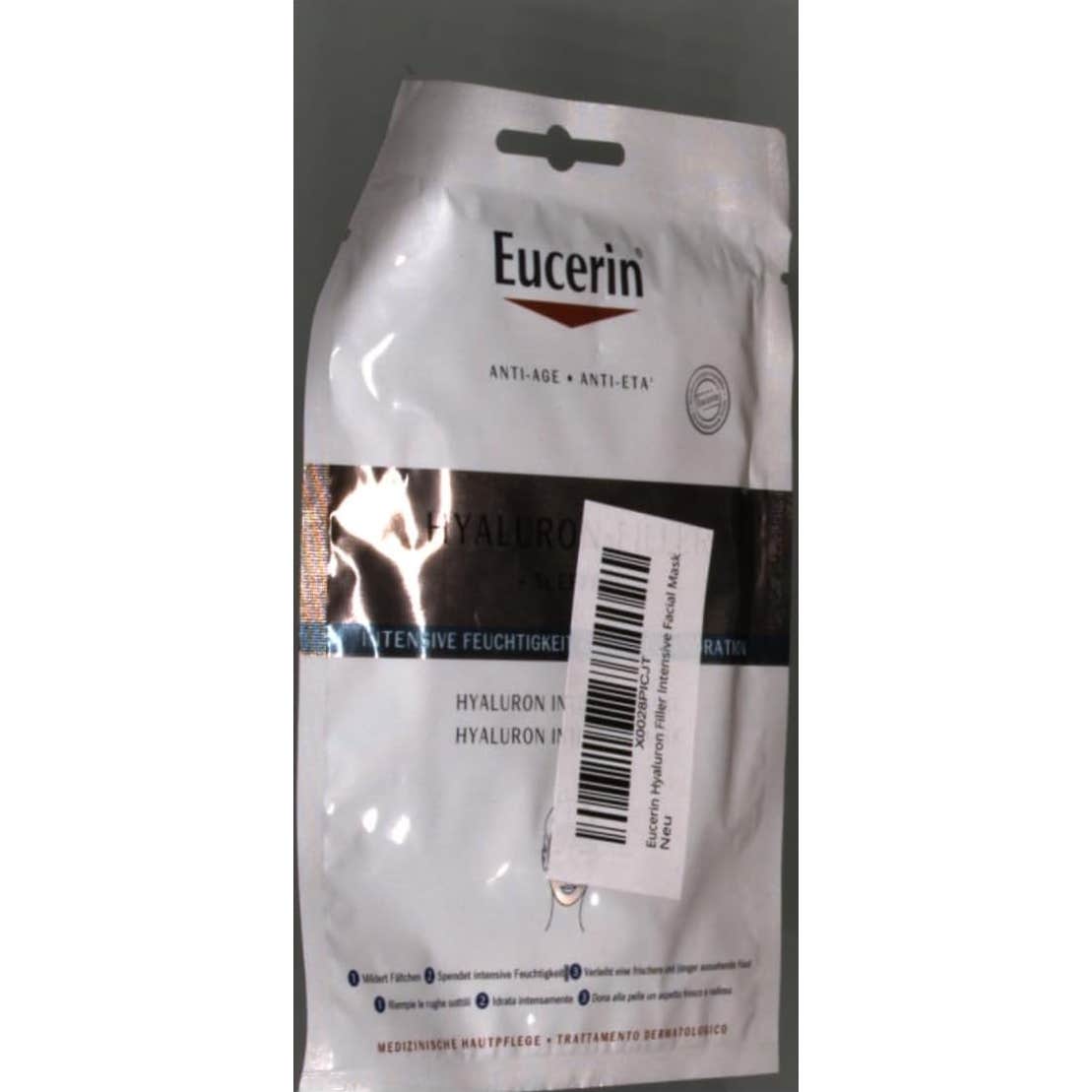 Eucerin Hyaluron-Filler 3X Effect Mascarilla Facial Intensiva 1ud es una mascarilla antiedad de biocelulosa que ayuda a rellenar las arrugas y líneas de expresión faciales gracias a su contenido en ácido hialurónico.