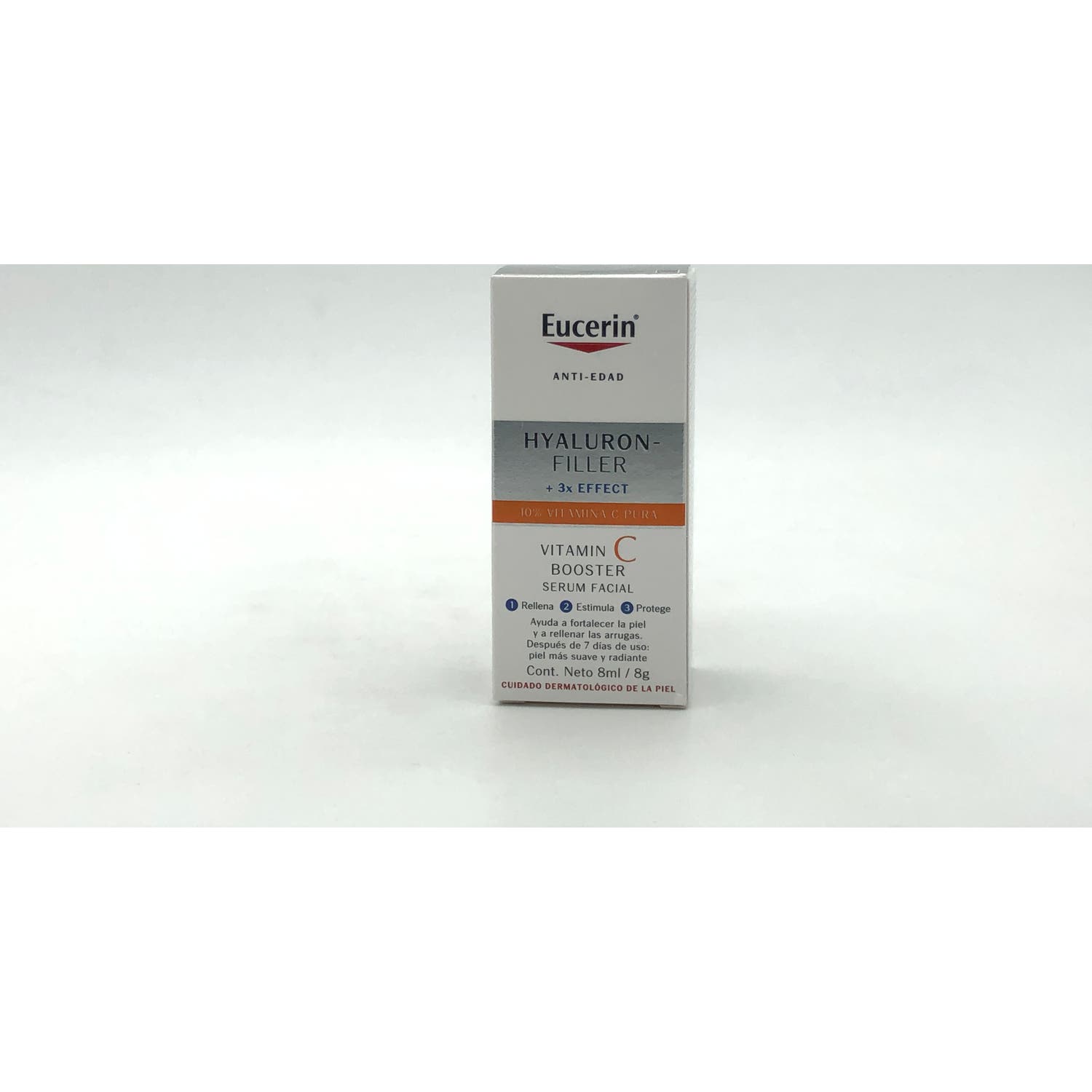 Eucerin Hyaluron-Filler 3X Effect Vitamin C Booster Sérum 8ml es un sérum antiedad de absorción rápida que ayuda a proteger la piel mientras rellena las arrugas y líneas de expresión faciales gracias a su contenido en ácido hialurónico.