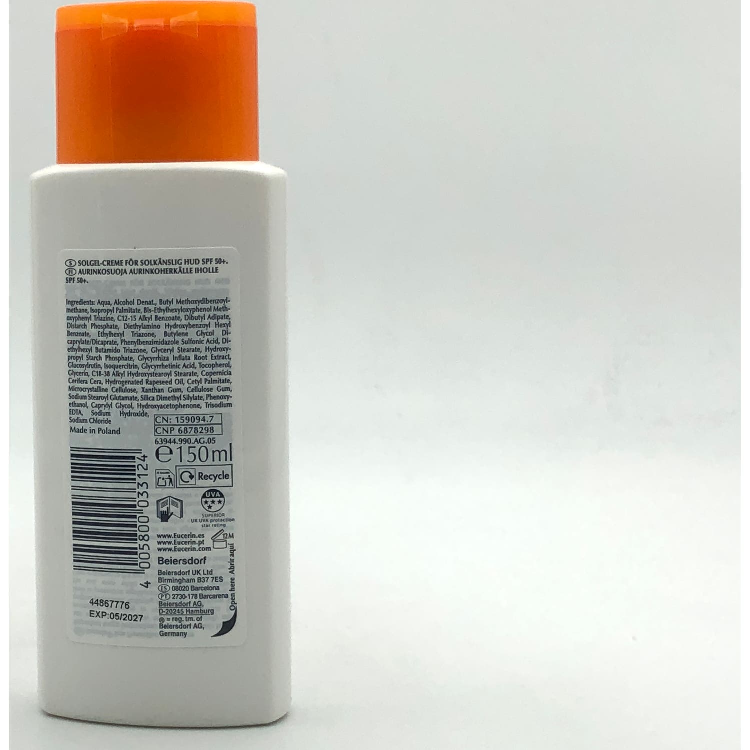 Eucerin Sun Allergy Protect Gel-Crema SPF50+ 150ml es un fotoprotector en textura crema-gel que permite una alta protección frente a los rayos UVA/UVB. Este tratamiento se ha diseñado especialmente para proteger las pieles con alergias solares como la Fotodermatosis Polimorfa (PLE) y acné estival.