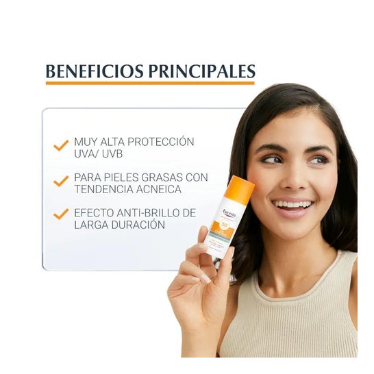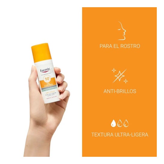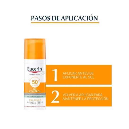 Eucerin Sun Gel-Crema Oil Control Dry Touch SPF50 50ml es un protector solar facial de uso diario para piel grasa que ayuda a combatir los efectos nocivos de las radiaciones solares UVA y UVB.