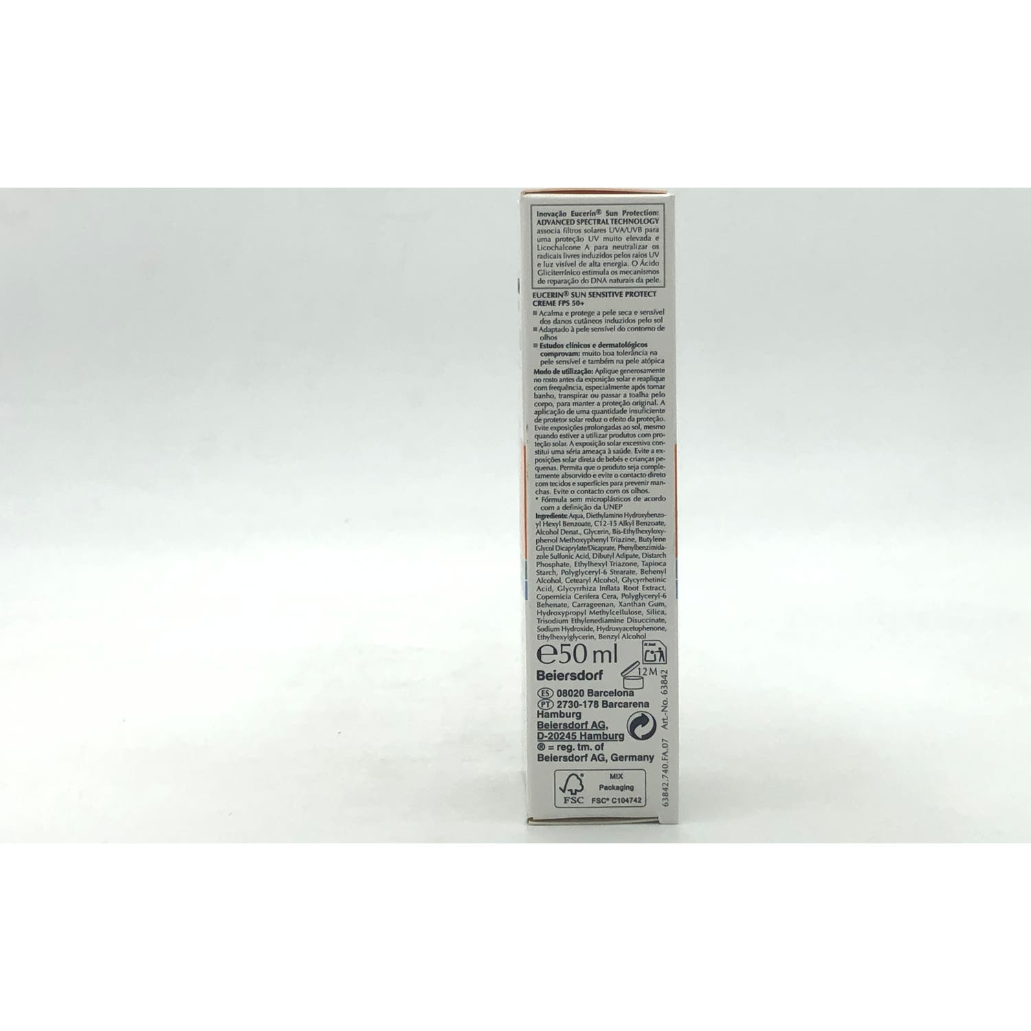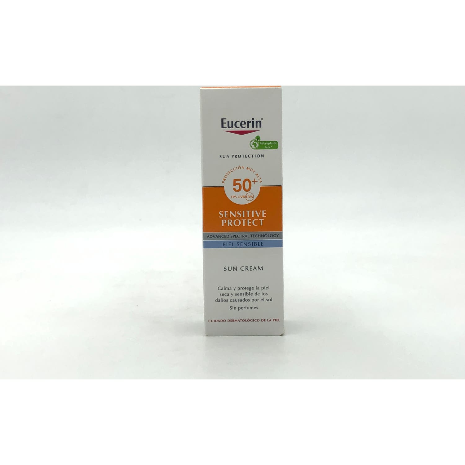 Eucerin Sun Creme Sensitive Protect SPF50+ 50ml es una crema facial con alto factor de protección solar alta de uso diario que ayuda a proteger y calmar la piel sensible y atópica.