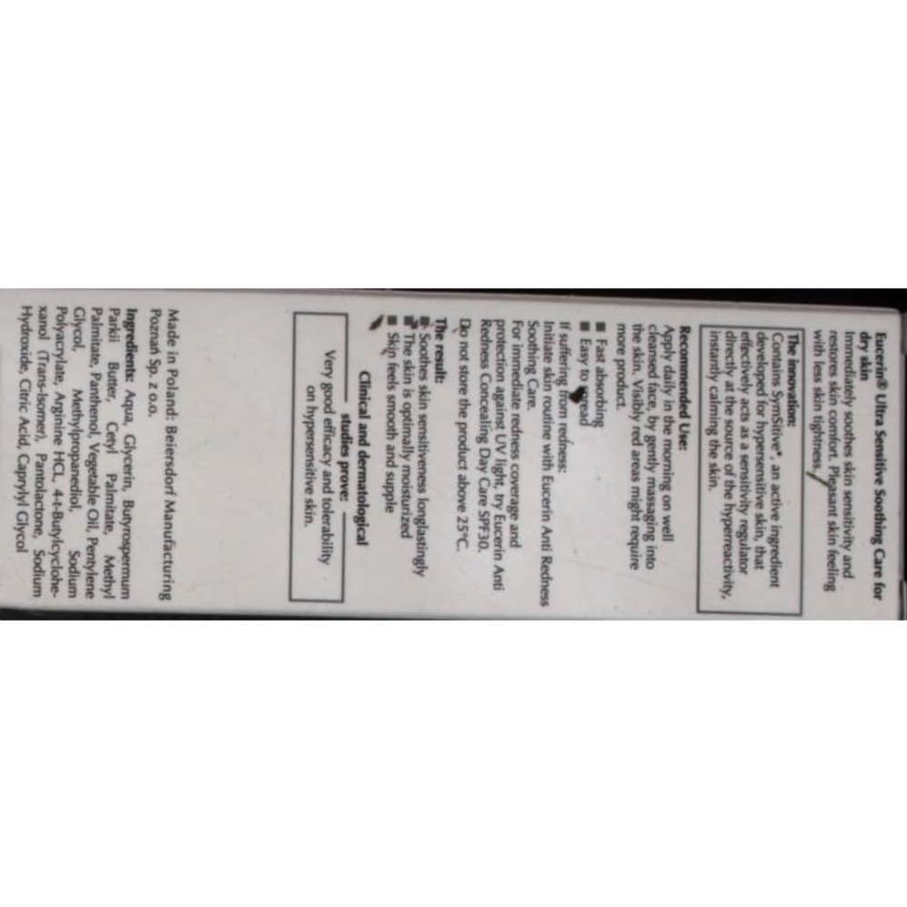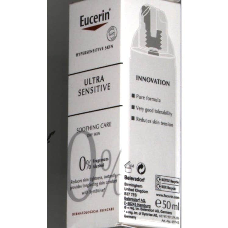 Este tratamiento calmante UltraSensitive está indicado para las pieles hipersensibles con tendencia a sensaciones desagradables de hormigueo o picor, pero sin rojeces visibles. Además de su función calmante, UltraSensible protege la barrera cutánea y aumenta el umbral de tolerancia de la piel. También constituye una excelente base de maquillaje. Penetra rápidamente. No comedogénico, sin conservantes, sin parabenos, sin parafinas, sin perfume, sin alcohol, sin colorantes, sin emulsionantes. Envase estéril anticontaminación. INFORMACIÓNEucerin UltraSensitive Crema Calmante para Piel Seca está diseñada para calmar la piel seca e hipersensible. Las sensaciones de irritación y sobrecalentamiento se calman al instante gracias a su innovador ingrediente activo llamado Symsitive, que reduce la hipersensibilidad de las fibras sensoriales.