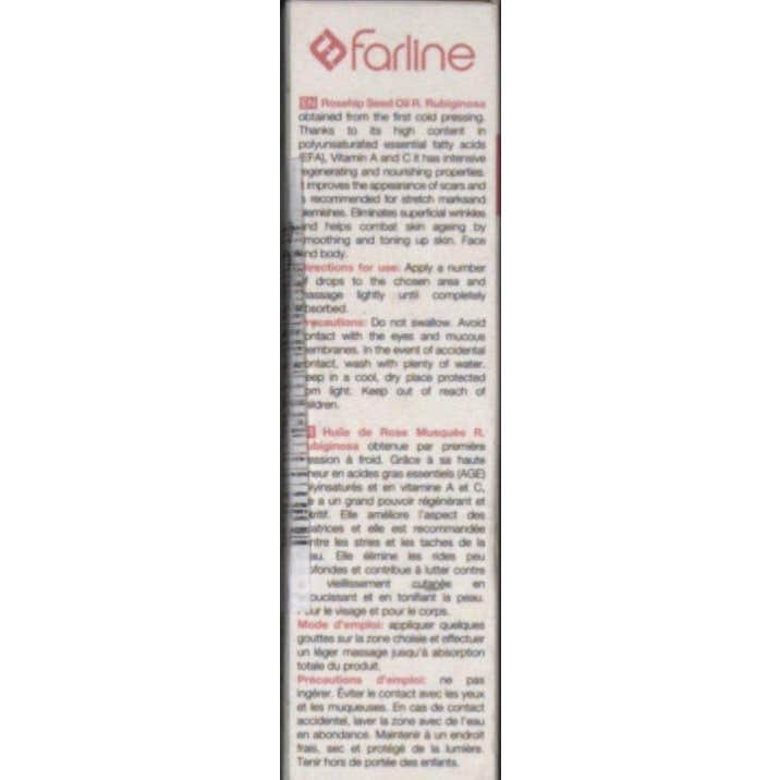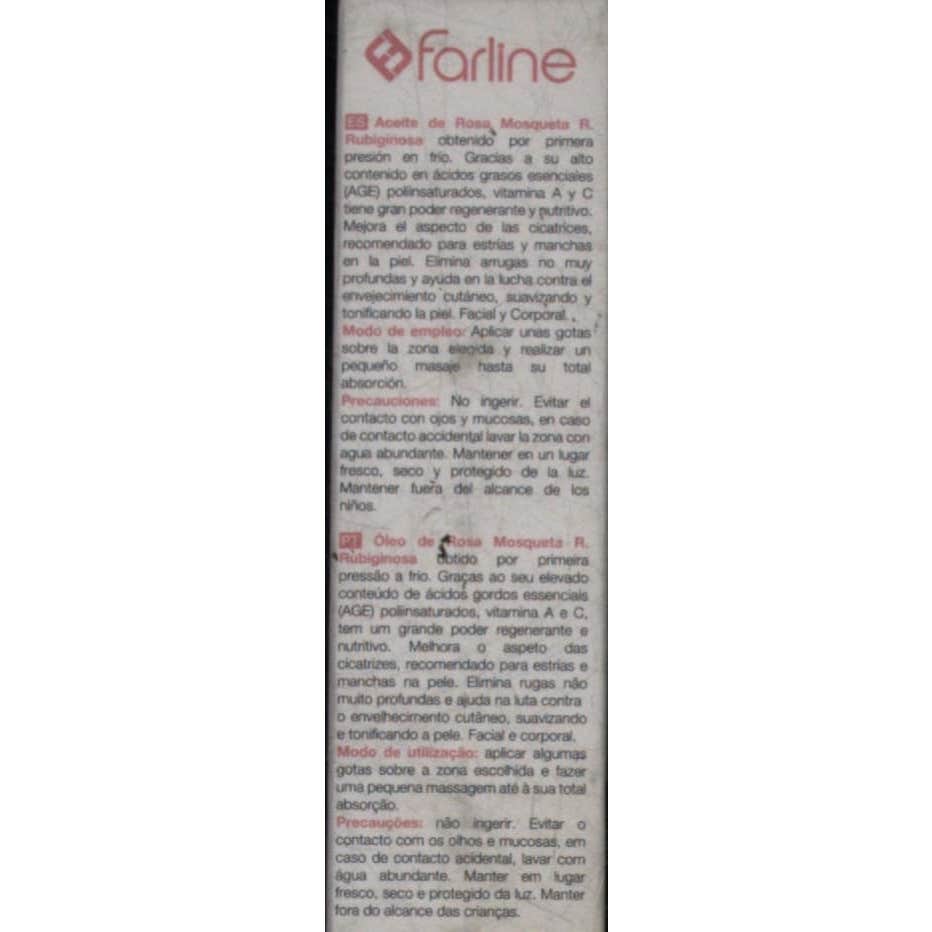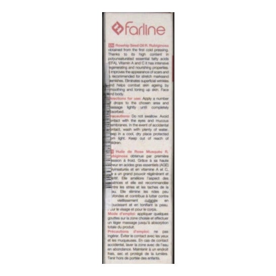 El aceite de rosa mosqueta de Farline tiene un gran poder regenerante que ayuda a eliminar las arrugas, estrías, manchas o cicatrices más superficiales de la piel. Un tratamiento cosmético idóneo para pieles maduras o envejecidas ya que tonifica y suaviza intensamente la piel del rostro y cuerpo. Gracias a su alto contenido en ácidos grasos esenciales (AGE) poliinsaturados, vitamina A y C, conseguirás una piel libre de imperfecciones.