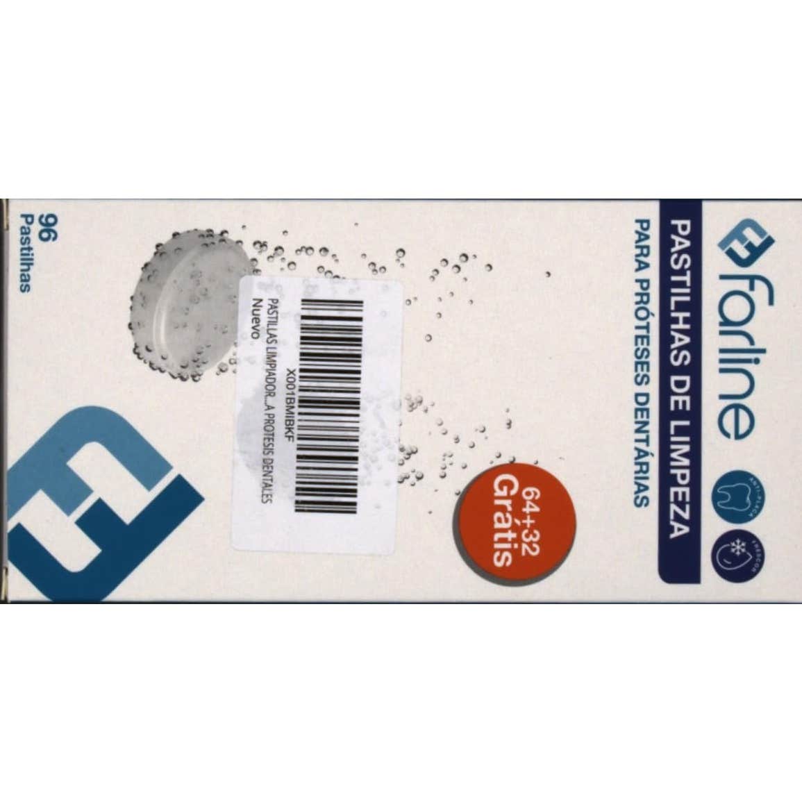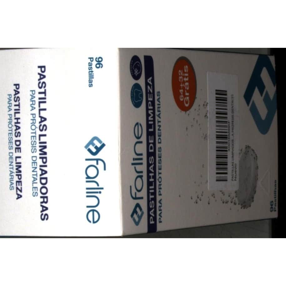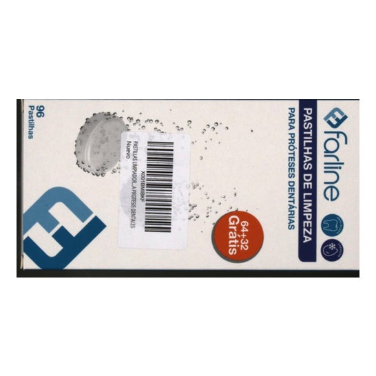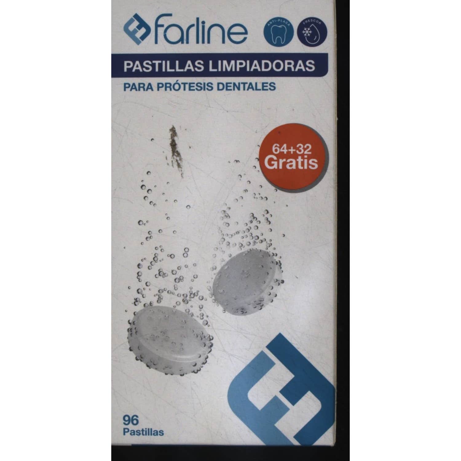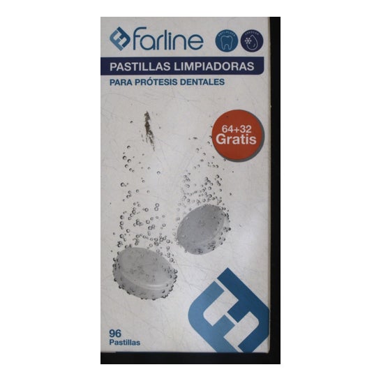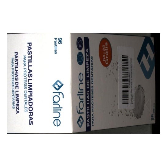 Farline Pastillas Limpiadoras 96uds son unas pastillas efervescentes para higienizar las prótesis dentales. Reduce la placa bacteriana que se adhiere a las prótesis, incluso en zonas en las que el cepillo no puede penetrar. Además, al eliminar esas bacterias se reduce el mal olor y la irritación de las encías.