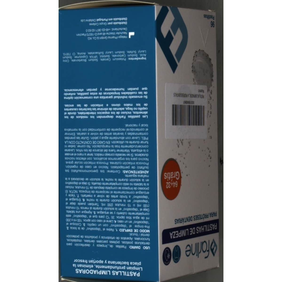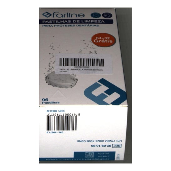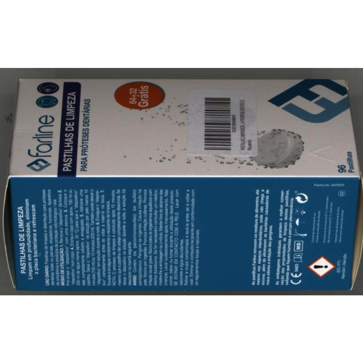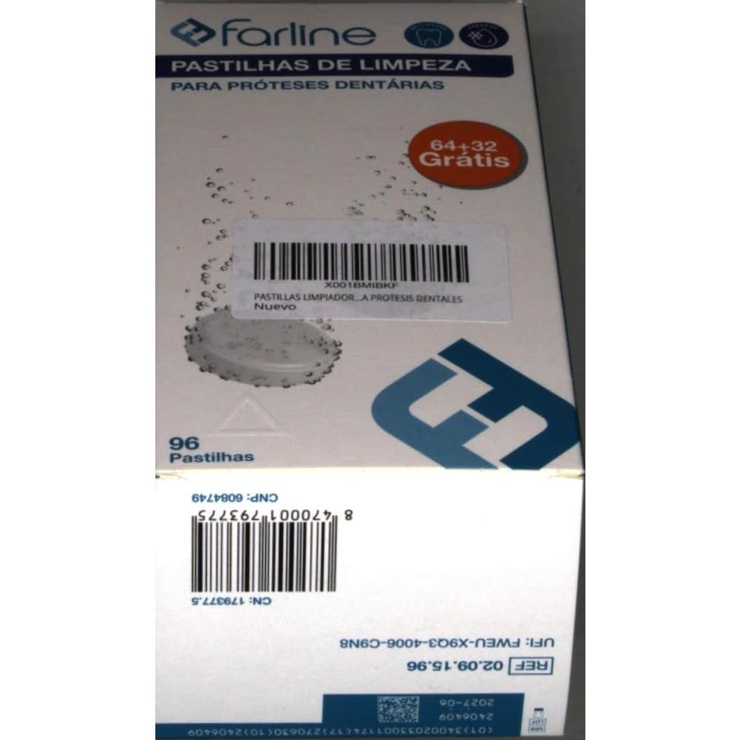 Farline Pastillas Limpiadoras 96uds son unas pastillas efervescentes para higienizar las prótesis dentales. Reduce la placa bacteriana que se adhiere a las prótesis, incluso en zonas en las que el cepillo no puede penetrar. Además, al eliminar esas bacterias se reduce el mal olor y la irritación de las encías.