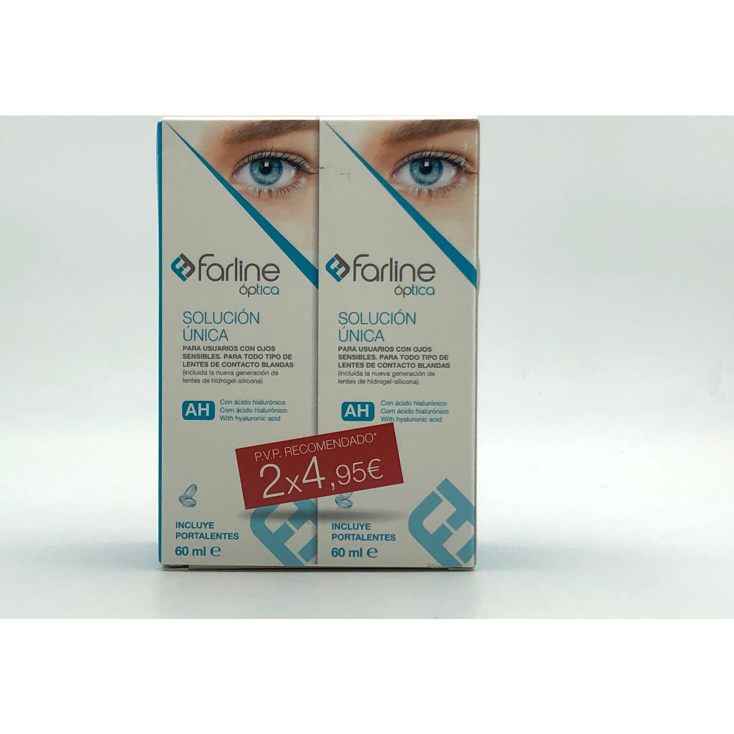 Sol Unica Ah Farlineopt2X60Ml es una solución única con Hialuronato Sódico en formato viaje de la marca Farline Óptica. Esta solución ayuda a desinfectar, limpiar y aclarar todo tipo de lentes de contacto, cuidando la salud de los ojos y proporcionando mayor comodidad tras su uso. Está formulada con ácido hialurónico de alto peso molecular para eliminar suciedad, bacterias y proteínas de las lentes, manteniendo una buena higiene y conservándolas en perfecto estado.