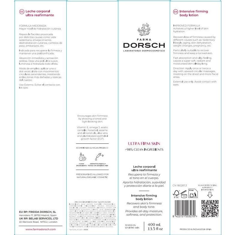 Farma Dorsch Crema Corporal Ultra Reafirmante 400ml es una loción que contribuye a reafirmar la piel del cuerpo y a reducir la flacidez cutánea.