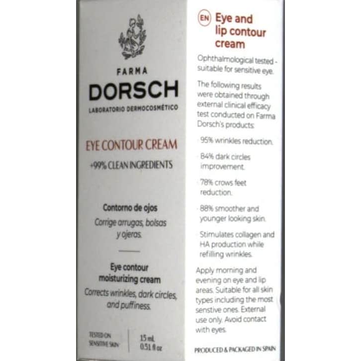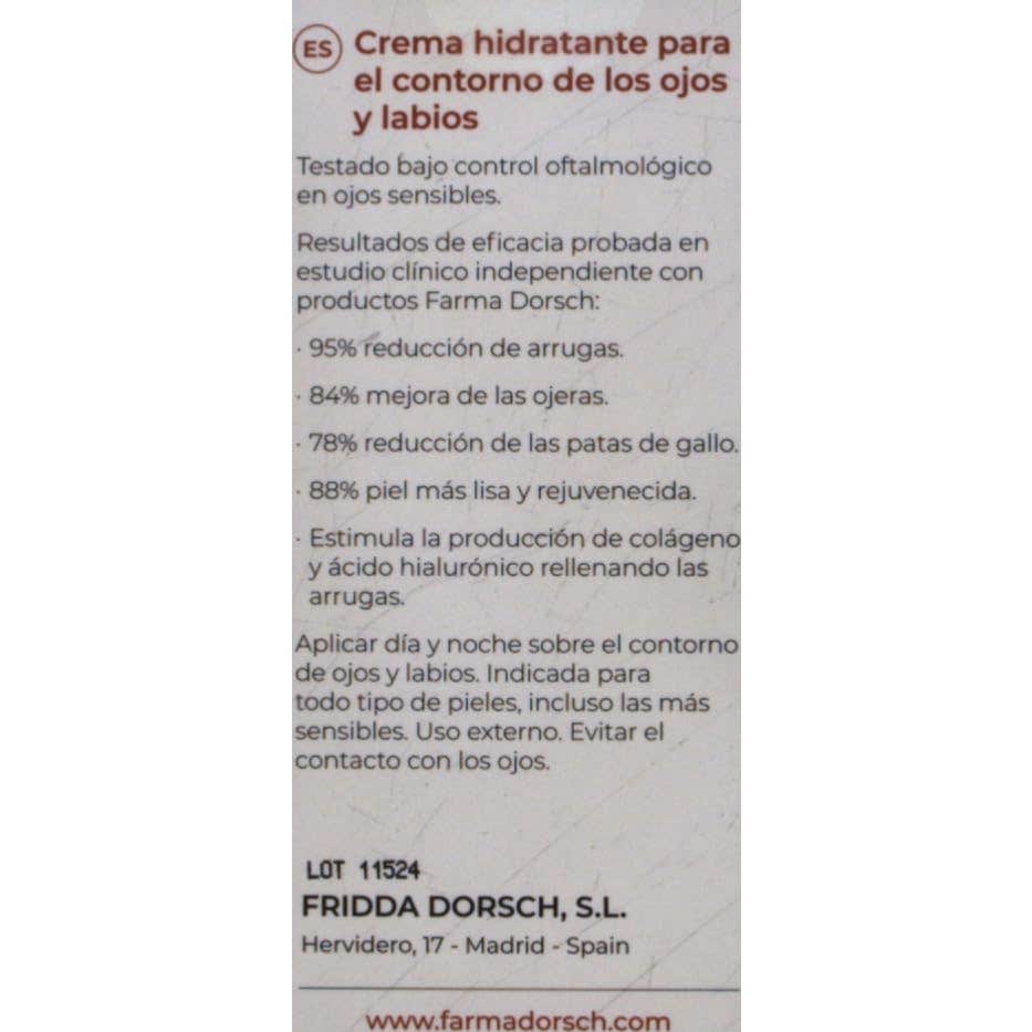 Farma Dorsch Eye Contour Cream 15ml es una crema especialmente indicada para el contorno de ojos que ayuda a reducir las arrugas del contorno de ojos y labios, disimulando los signos de la edad. Asimismo, facilita la renovación celular de la piel del contorno de ojos y favorece la formación de colágeno natural, gracias a su fórmula con silicio orgánico. Contiene 15ml.