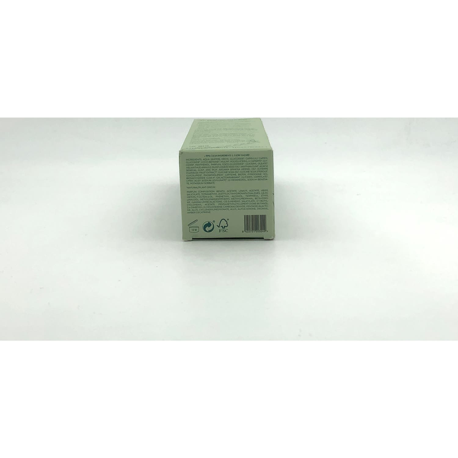 WATER, DECILGLUCOSIDE, CAPRILIL GLUCOSIDE, BETAINE OF COCONUT, POLYMERIL-4 CAPRATE, INULIN, GLYCEROL, PANTENOL, PERFUME, COCONUT GLYCOSIDE, GLYCERYL OIL, HELIANTHUS OIL ANNUUS (SUNFLOWER), XANTHAN RUBBER, ACACIA SENEGAL CHEWING GUM , ZINC PCA, SPINOSA ARANIA SEED OIL, EUTERPE OLEACEA FRUN EXTRACT, SOYCINE GLYCINE OIL SUB GLYLINE, GLYOLIPIDE, FOSFOLOGIDE, CAFFEY, BOTIN, PYRIDOXIN HYDROCHLORIDE, BIOSACCHARIDES GUM-4, GALACABINAN GLYCERYL, CITRIC ACID, SODIUM LEVULINATE, 1,2-HEXANEIDOL, SODIUM BENZOATE, POTASSIUM SORBATE, PERFUME COMPOSITION :, 1,1-DIMETHYL-2-PHENYLETHYL ACETATE, 2,4-DIMETHYL-3-CYCLOHEXENE- 1-CARBOXALDEHYDE, 2,6-DIMETHYLOCT-7-EN-2-OL, 2-TERT-BUTYL-CYCLOHEXENYL ACTATE, ALLYL CYCLOHEXYLPROPTION, AMBER DECATRIENE, BENZYL ACETATE, BETA-IONONE, CIS-3 HEXENYL SALICYLATE, DECOWAL, ETHYL LINALOOL, GAMMA-UNDECALACTONE, ETILHE XIL SALICYLATE, LINALILO ACETATE, METHYLPROPANAL METHYLPOWER, PENTADECALACTONE, PENTA-METHYLCYCLOPENT-3-ENE-BUTANOL, FENNEL ALCOHOL, GOAT LEAF OIL POGOSTEMON, TERPINEOL, TETRAMETHYL ACETYLOCTAY-DRONAPHTHALENES.