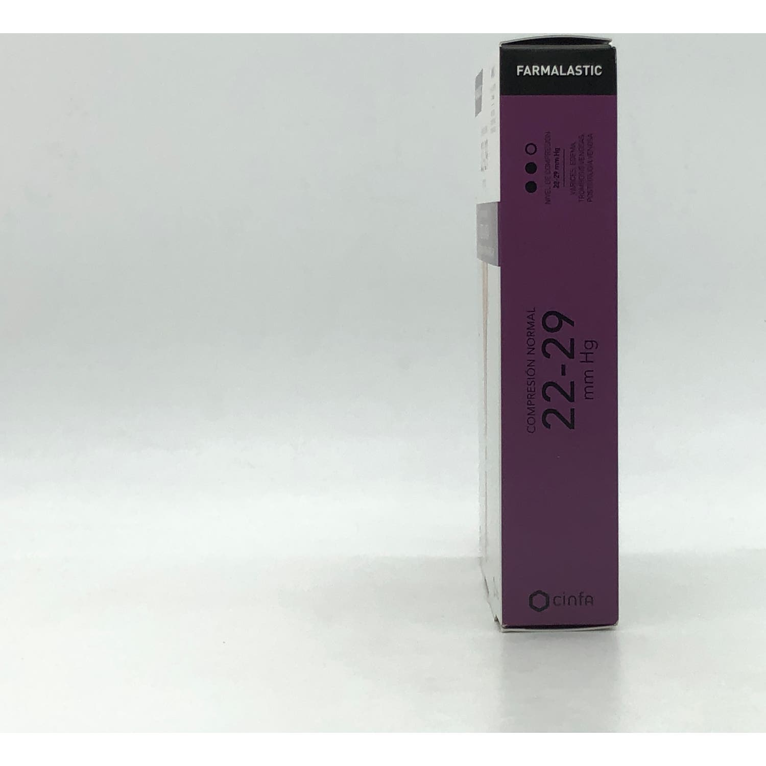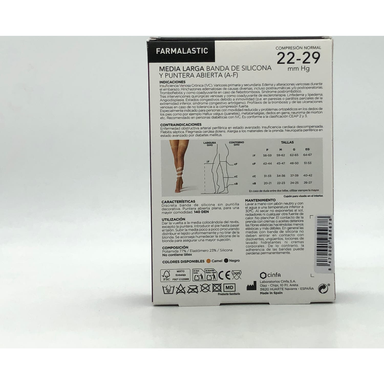 Media larga con puntera abierta, producto sanitario desarrollado con cumplimiento del RD 1591/2009 de productos sanitarios. El producto proporciona una compresión normal sobre la zona, con presión de 22-29 mmHg. Producto diseñado para mujeres, elaborado con Poliamida del 80% y Elastómero del 20%.