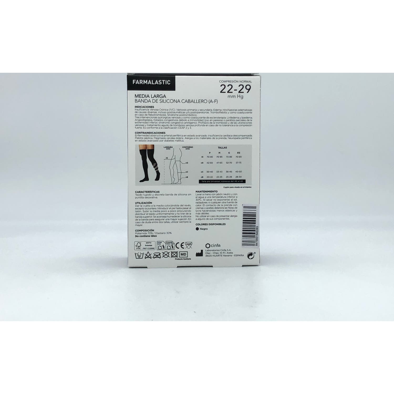 Farmalastic Media Larga Caballero Compresión Normal TG negro está indicado para personas que sufren problemas circulatorios, hinchazones o varices. Asimismo, también son útiles para personas que pasan largos periodos de tiempo de pie y su poder de compresión ayuda a mejorar la circulación sanguínea.Se sujeta con una banda de silicona sin puntilla y tiene un tejido tupido (140 den) y con alto contenido en algodón. . La T-grande tiene aproximadamente un contorno de pantorrilla de 37-39 cm y de tobillo 24-25 cm.*Por motivos de higiene, no se aceptarán cambios ni devoluciones de este producto.