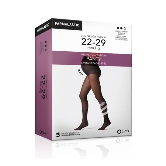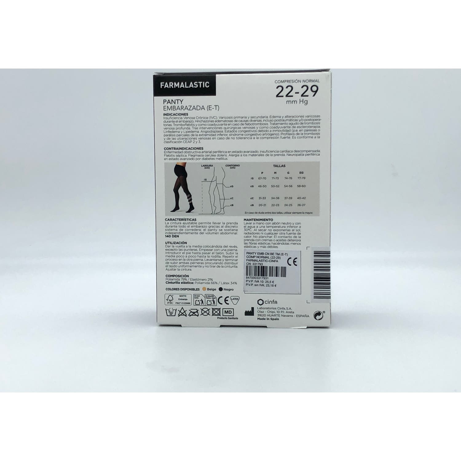 Farmalastic panty embarazada (E-T) compresión normal T-mediana beige son unas medias de compresión que ayuda a mejorar la circulación en embarazadas y a prevenir la sobrecarga de la circulación.Están diseñadas con una parte frontal flexible y fácilmente acomodable a esa pancita de embarazada para no molestar al bebé.Está indicado su uso para cuidar las piernas cansadas.La T-mediana tiene aproximadamente un contorno de pantorrilla de 34-36 cm y de tobillo 22-23 cm.Por motivos de higiene, no se aceptarán cambios ni devoluciones de este producto.