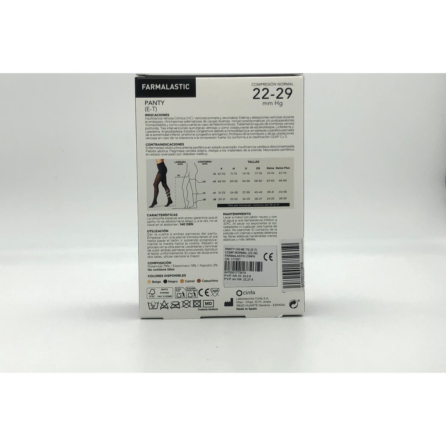 Farmalastic panty-media hasta la cintura (E-T) compresión normal T-grande negro son pantys con una compresión normal de 22-29 mmHg ideales para aquellas personas con problemas circulatorios, varices, hinchazón o que por su trabajo permanecen de pie largos periodos de tiempo.