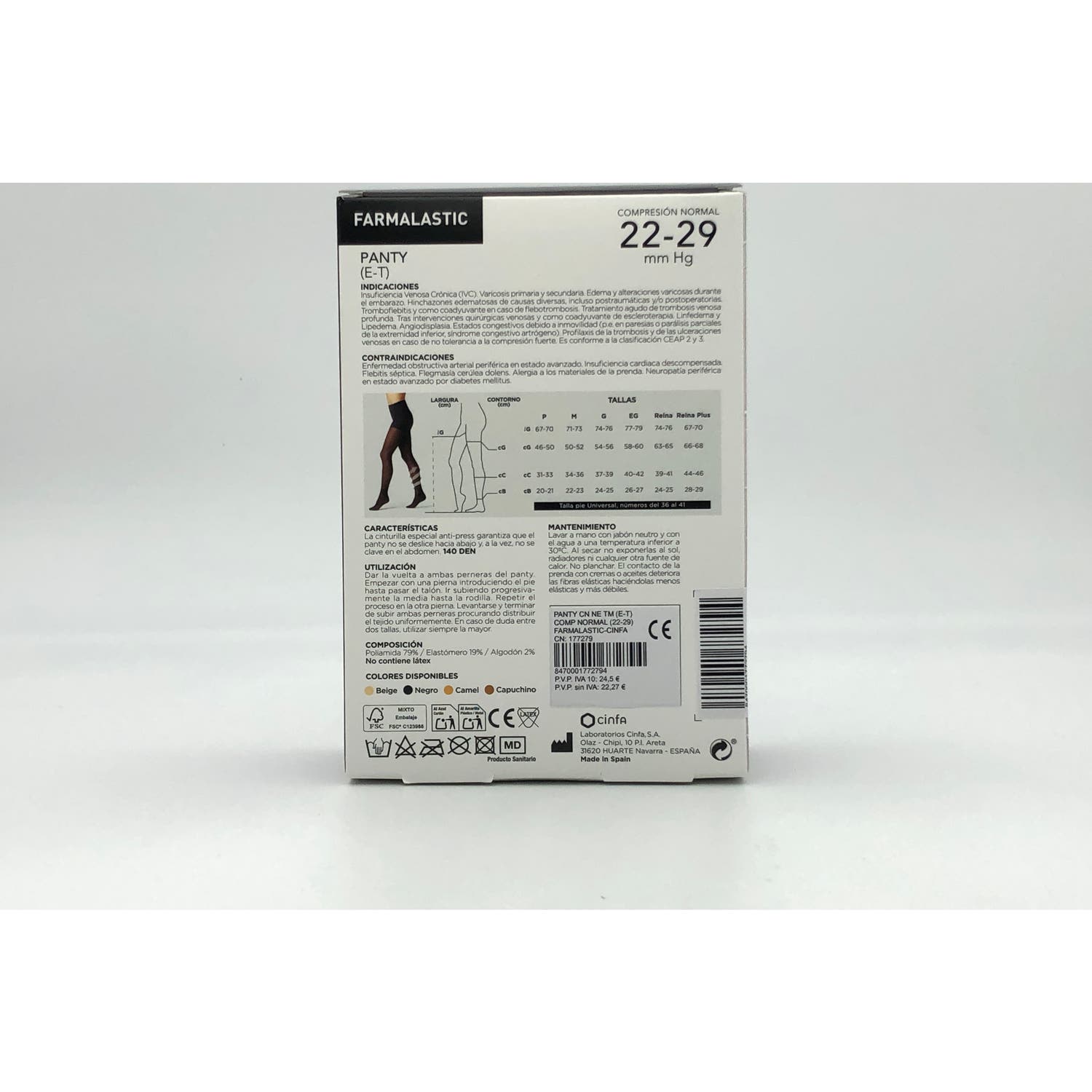 Farmalastic Panty T-Media Compresión Normal Negro es un panty de compresión normal que llega hasta la cintura. Estas medias colaboran a mejorar problemas circulatorios, varices, hinchazón y son ideales para aquellas personas que permanecen de pie durante largos periodos de tiempo. Además, contribuyen a ejercer una acción relajante frente a la sensación de fatiga y molestias en las piernas, así como ante problemas de varices.La Talla Mediana corresponde a un contorno aproximado de: 34-36cm de pantorrilla y de 22-23cm de tobillo. *Por motivos de higiene no se aceptan cambios, ni devoluciones.