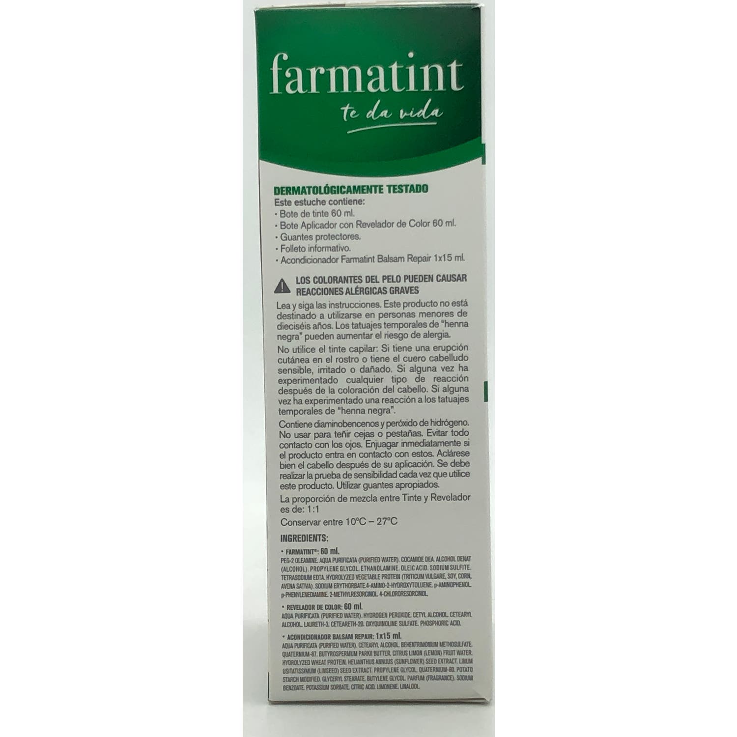Colorante farmatint 60 ml. PEG-2 OLEAMINE; AQUA PURIFICATA (PURIFIED WATER); COCAMIDE DEA. ALCOHOL DENAT (ALCOHOL); PROPYLENE GLYCOL; OLEIC ACID; ETHANOLAMINE. P-PHENYLENEDIAMINE; SODIUM SULFITE; TETRASODIUM EDTA; HYDROLYZEDVEGETABLE PROTEIN (TRITICUM VULGARE, SOY, CORN, AVENA SATIVA); SODIUMERYTHORBATE; N, N-BIS (2-HYDROXYETHYL)-P-PHENYLENEDIAMINE SULFATE. 2-AMINO-4-HYDROXYETHYLAMINOANISOLE SULFATE. 4 CHLORORESORCINOL.