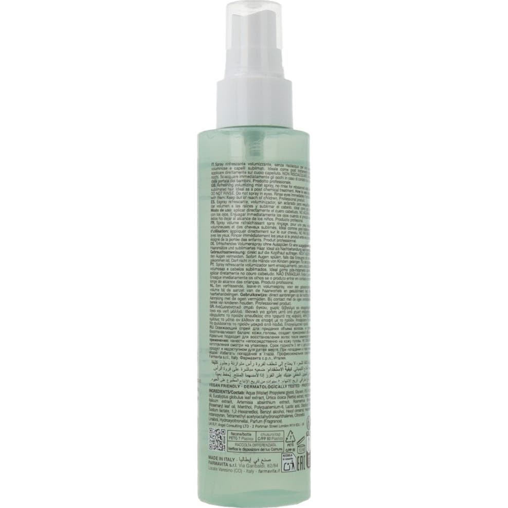 Farmavita Amethyste Scalp Hair Refreshing Volumizing Mist 150 ml es un spray sin aclarado diseñado para reequilibrar y refrescar el cuero cabelludo. Aporta volumen inmediato en las raíces, especialmente después de tratamientos químicos como coloraciones o decoloraciones.
