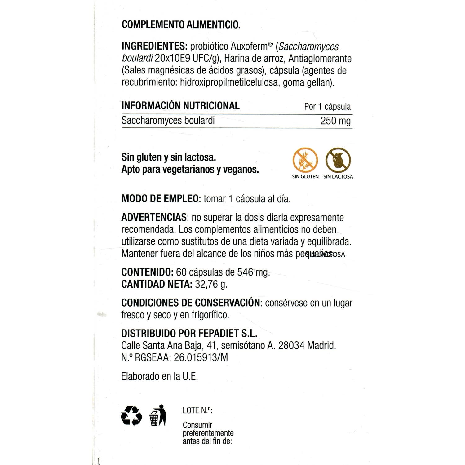 Complemento alimenticio en forma de cápsulas, elaborado a base de una cepa probiótica de saccharomyces boulardii y harina de arroz, que contribuye a promover la restauración de la flora intestinal.