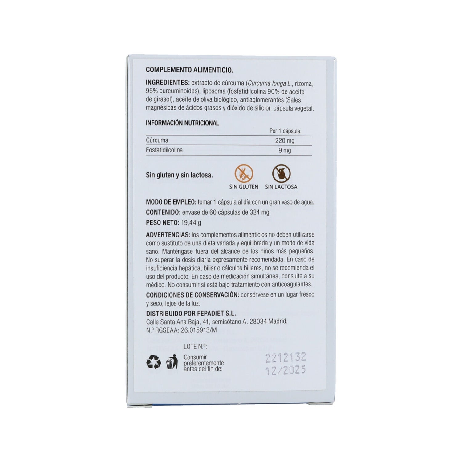Complemento alimenticio con extracto de cúrcuma en cápsulas de celulosa. Contiene además liposoma, aceite de oliva, estearato de magnesio y silicio. No contiene gluten ni lactosa. Tomado con regularidad y en la dosis sugerida, junto a una dieta variada y equilibrada, este complemento favorece las digestiones normales gracias a sus propiedades antiinflamatorias y antioxidantes. Indicado para adultos.