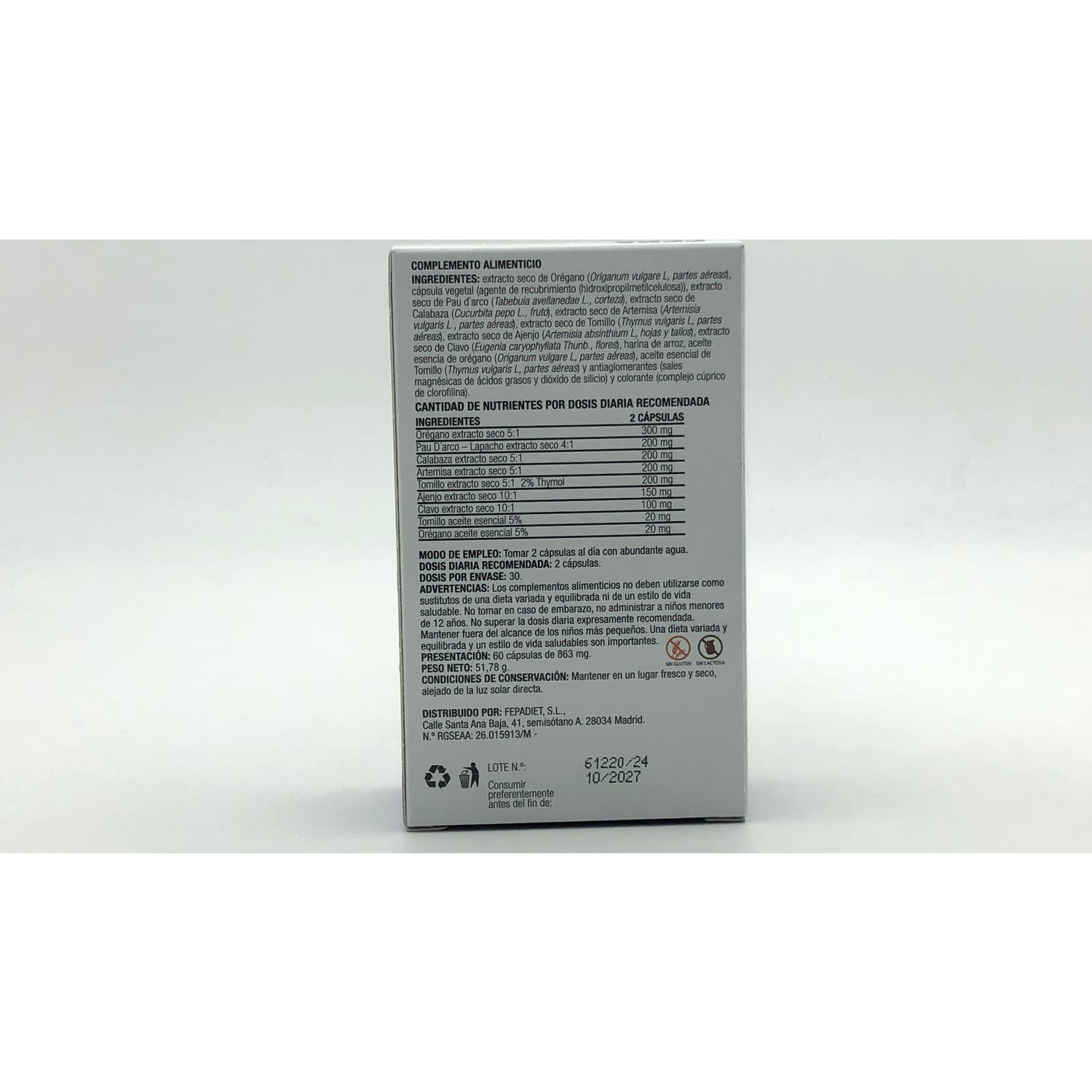 Extracto seco de Orégano (Origanum vulgare L, partes aéreas), cápsula vegetal (agente de recubrimiento (hidroxipropilmetilcelulosa)), extracto seco de Pau d`arco (Tabebuia avellanedae L., corteza), extracto seco de Calabaza (Cucurbita pepo L., fruto), extracto seco de Artemisa (Artemisia vulgaris L , partes aéreas), extracto seco de Tomillo (Thymus vulgaris L, partes aéreas), extracto seco de Ajenjo (Artemisia absinthium L, hojas y tallos), extracto seco de Clavo (Eugenia caryophyllata Thunb., flores), harina de arroz, aceite esencia de orégano (Origanum vulgare L, partes aéreas), aceite esencial de Tomillo (Thymus vulgaris L, partes aéreas) y antiaglomerantes (sales magnésicas de ácidos grasos y dióxido de silicio) y colorante (complejo cúprico de clorofilina).