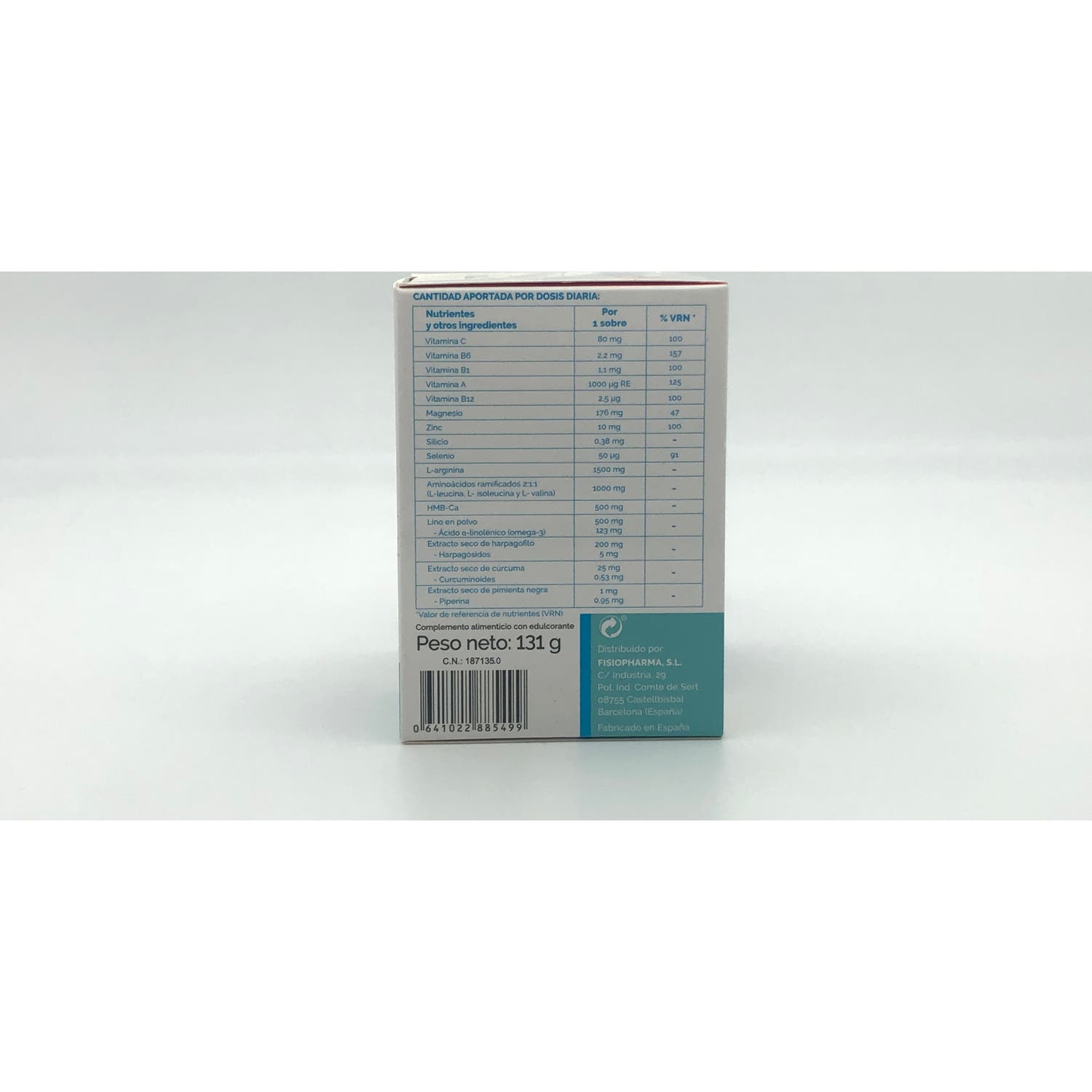 Este producto es de la marca Fisiopharma y contiene sobres que se administran cada uno en una dosis. Es un complemento alimenticio que contiene pequeñas cantidades de vitaminas y minerales. Y la finalidad de ellos es ayudar al tejido muscular a reponerse tras sufrir un daño determinado. A su vez, favorece la minimización de los síntomas que este tipo de afecciones desencadena. En general, ayuda a los músculos a recobrar su estado natural.