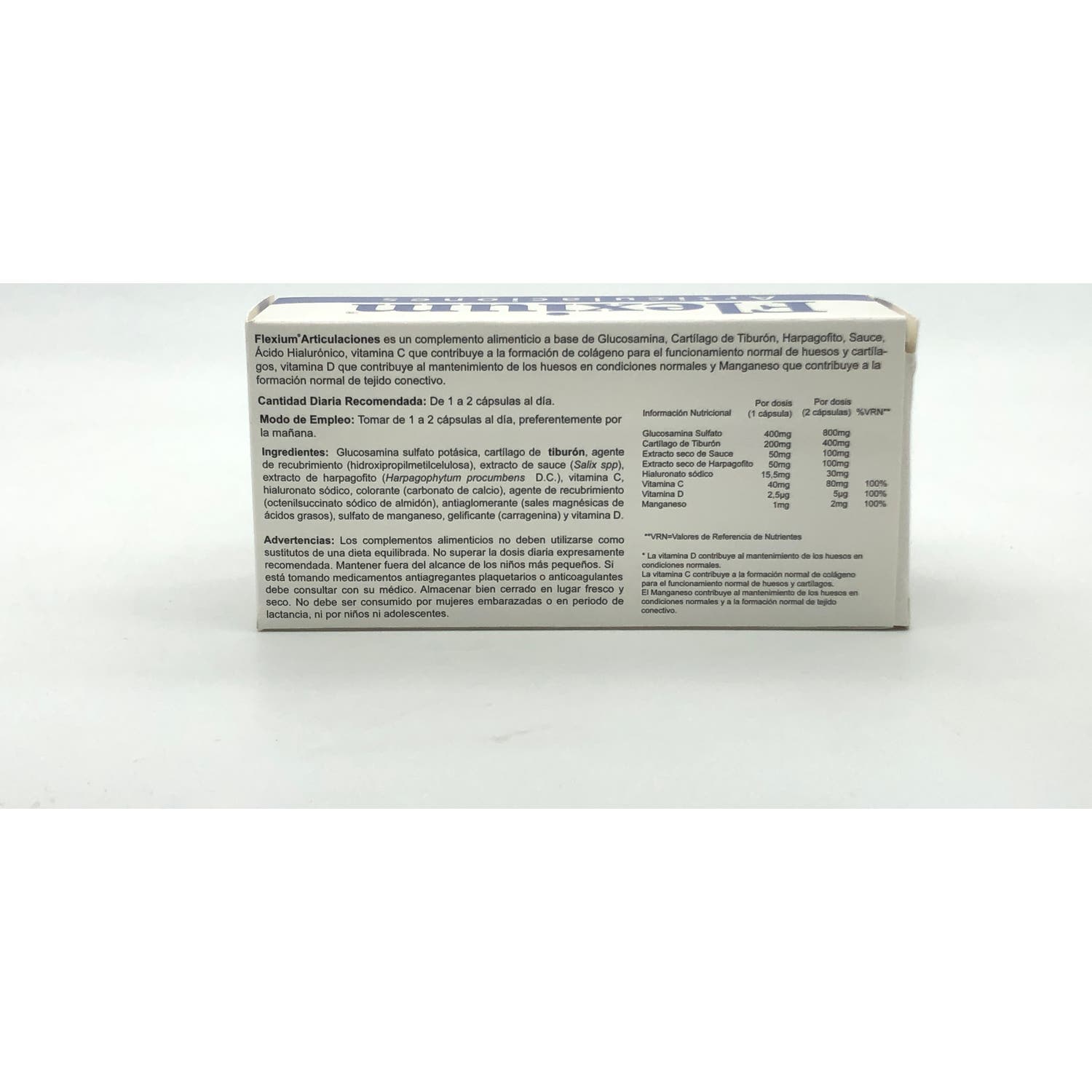 SULFATO DE GLUCOSAMINA,CARTÍ­LAGO DE TIBURÓN, SAUCE EXTRACTO SECO, HARPAGOFITO,VITAMINA C (ÁCIDO L-ASCÓRBICO), HIALURONATO SÓDICO,SULFATO DE MANGANESO, VITAMINA D3 (COLECALCIFEROL), ANTIAGLOMERANTE (E-470B), CÁPSULA (GELATINA,COLORANTE E-171) ,