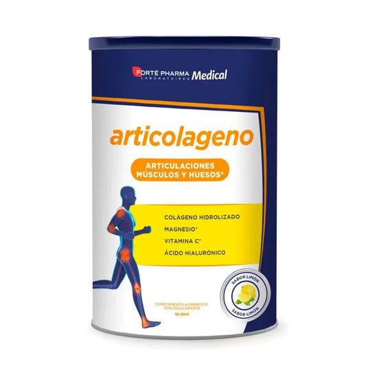 Forté Pharma Articolágeno Sabor Limón 349,5g es un complemento alimenticio a base de colágeno hidrolizado, ácido hialurónico, magnesio y Vitamina C.
