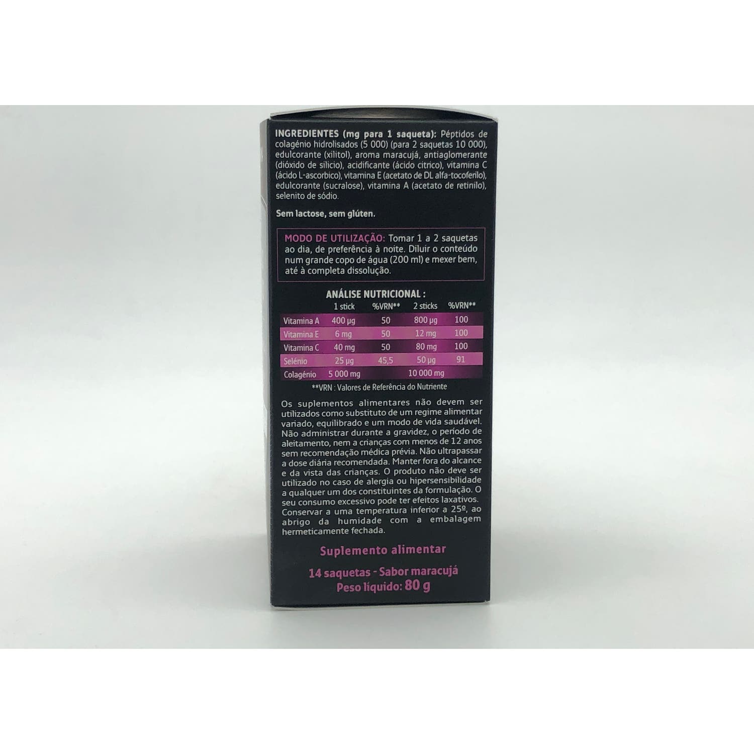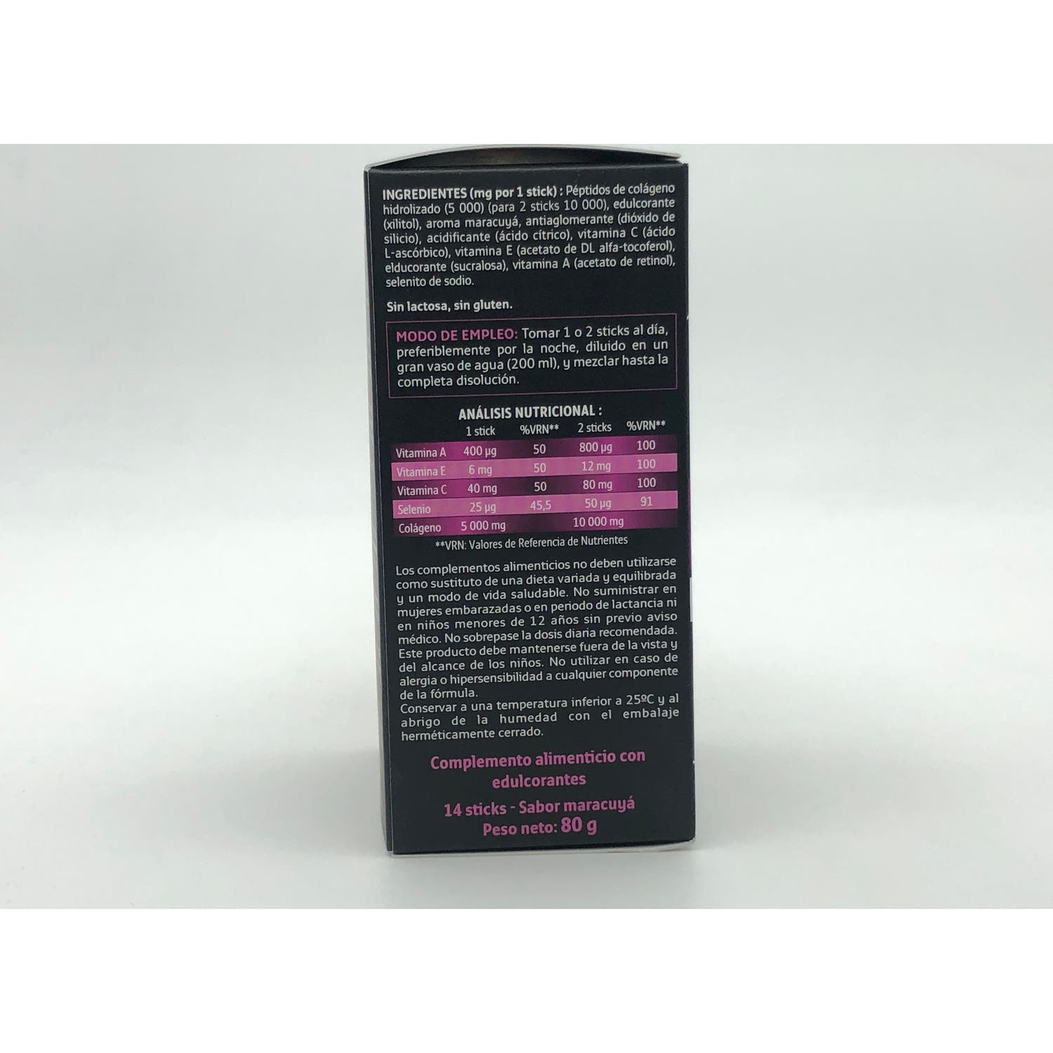 Colágeno (5000 mg), Vitamina A (100 mcg), Vitamina C (40 mg), Vitamina E (6 mg), Selenio (25 mcg).