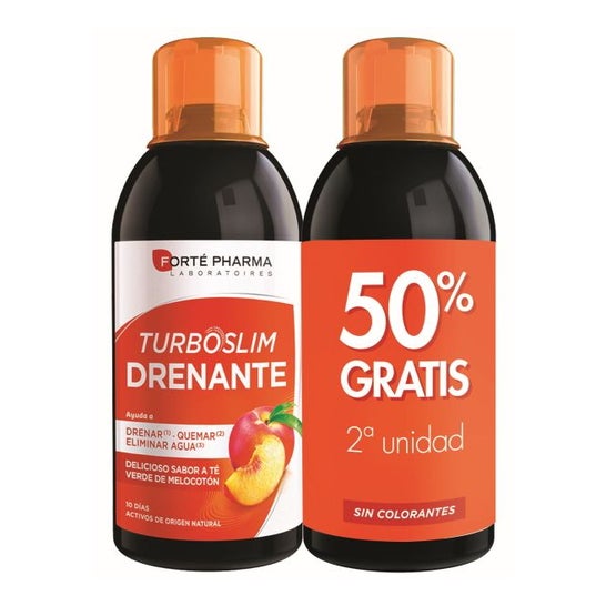 Forté Pharma Turboslim Melocotón 2x500ml es un complemento alimenticio que ayuda a drenar y purificar el organismo.