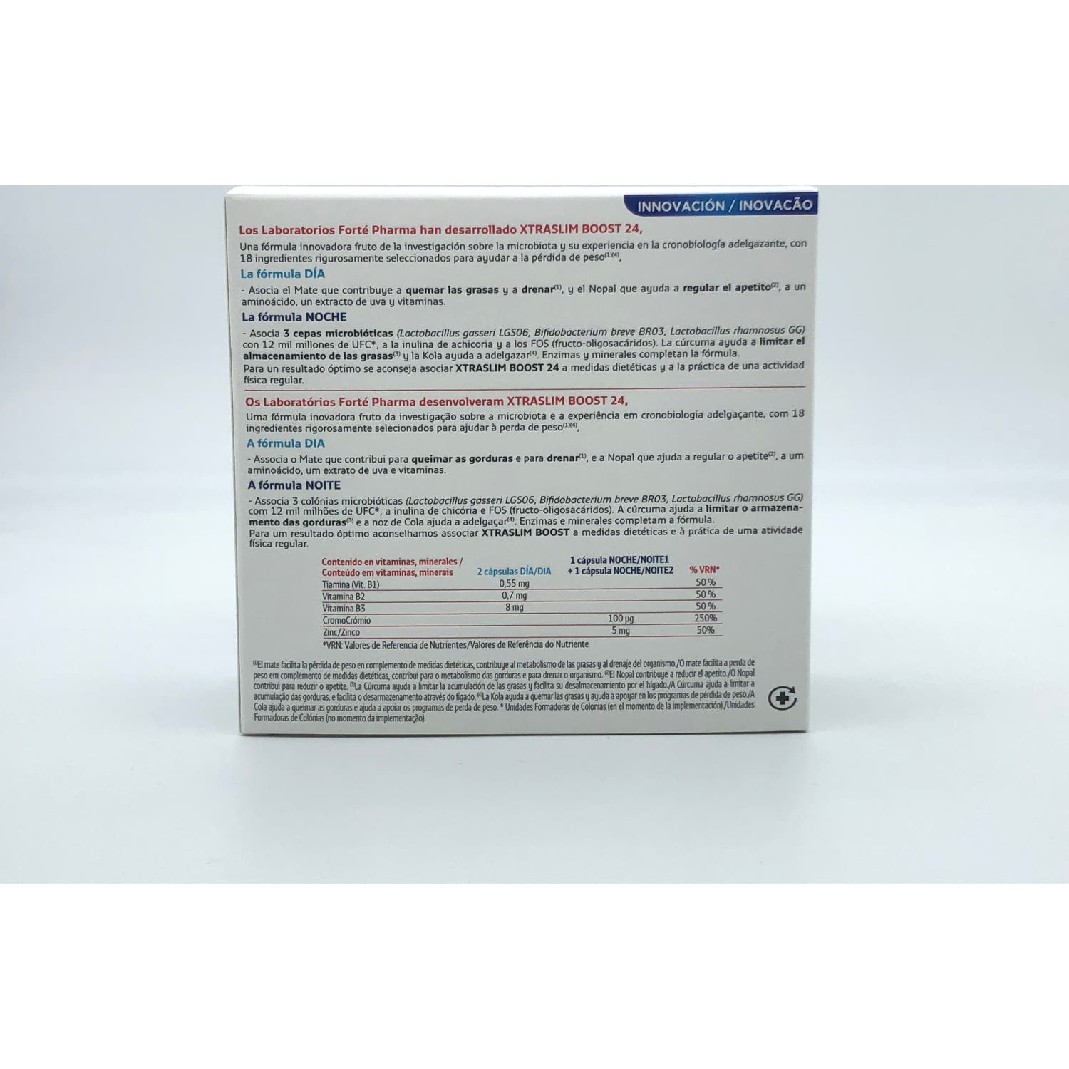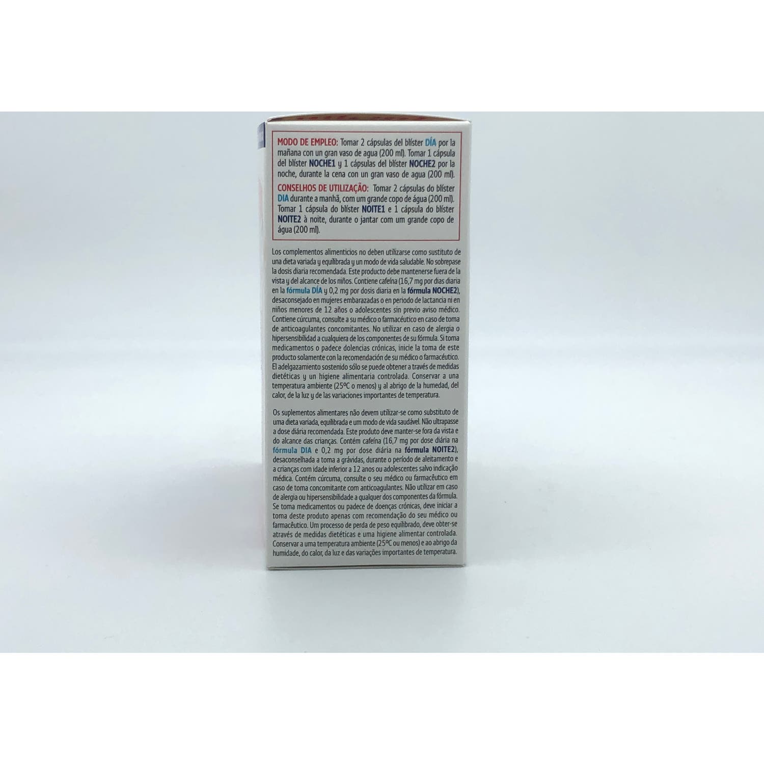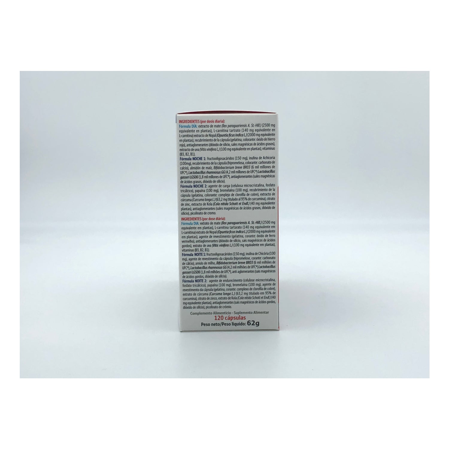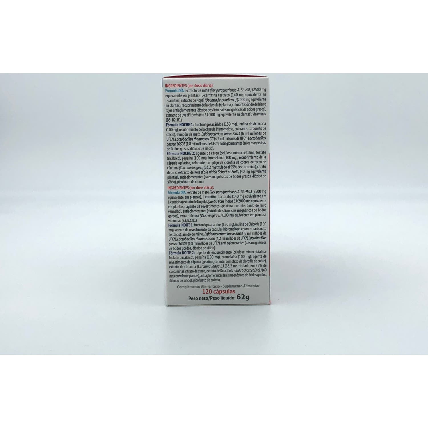 Por otro lado, la fórmula de noche contribuye a reducir el almacenamiento de grasas y a reducir el peso, por a la acción de 3 cepas microbióticas (Lactobacillus gasseri LGS06, Bifidobacterium breve BR03, Lactobacillus rhamnosus GG), la inulina de achicoria, fructo-oligosacáridos, cúrcuma, Kola, enzimas y minerales.