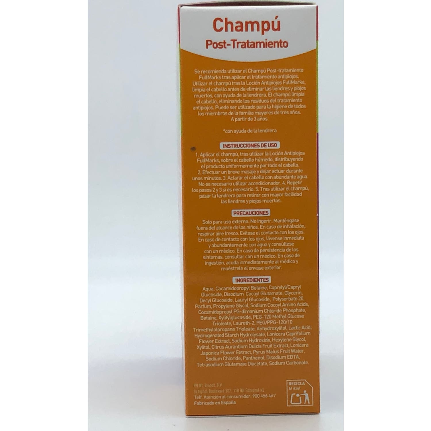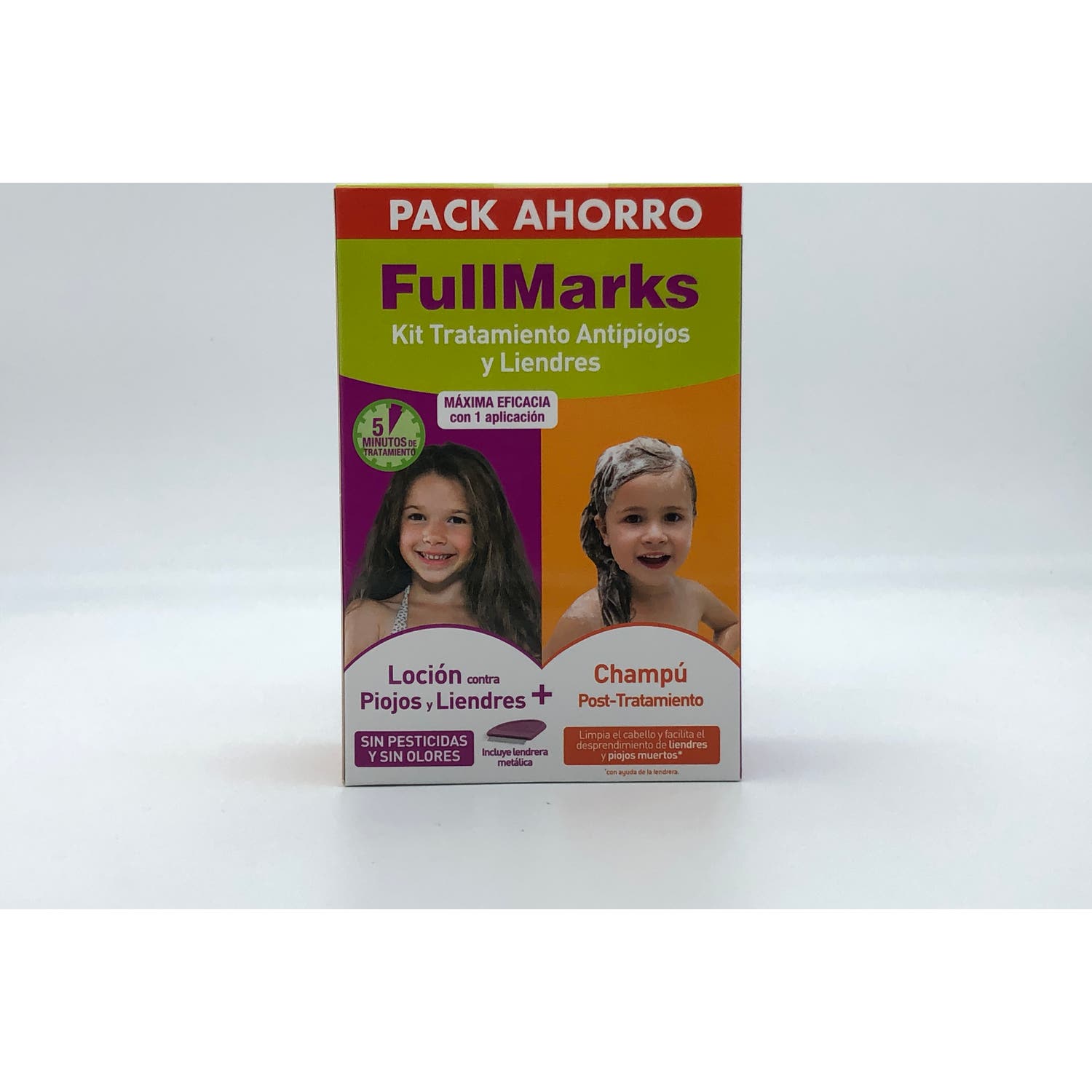 Tratamiento contra la infestación de piojos y liendres de la marca FullMarks. Con el uso de estos productos, el cabello estará limpio y sin este incómodo problema. El combo incluye una loción antipiojos, un champú para el tratamiento posterior y una lendrera de metal. Con la loción se puede matar a los piojos en tan solo cinco minutos, sin causar daño al cuero cabelludo o a la estructura del pelo.