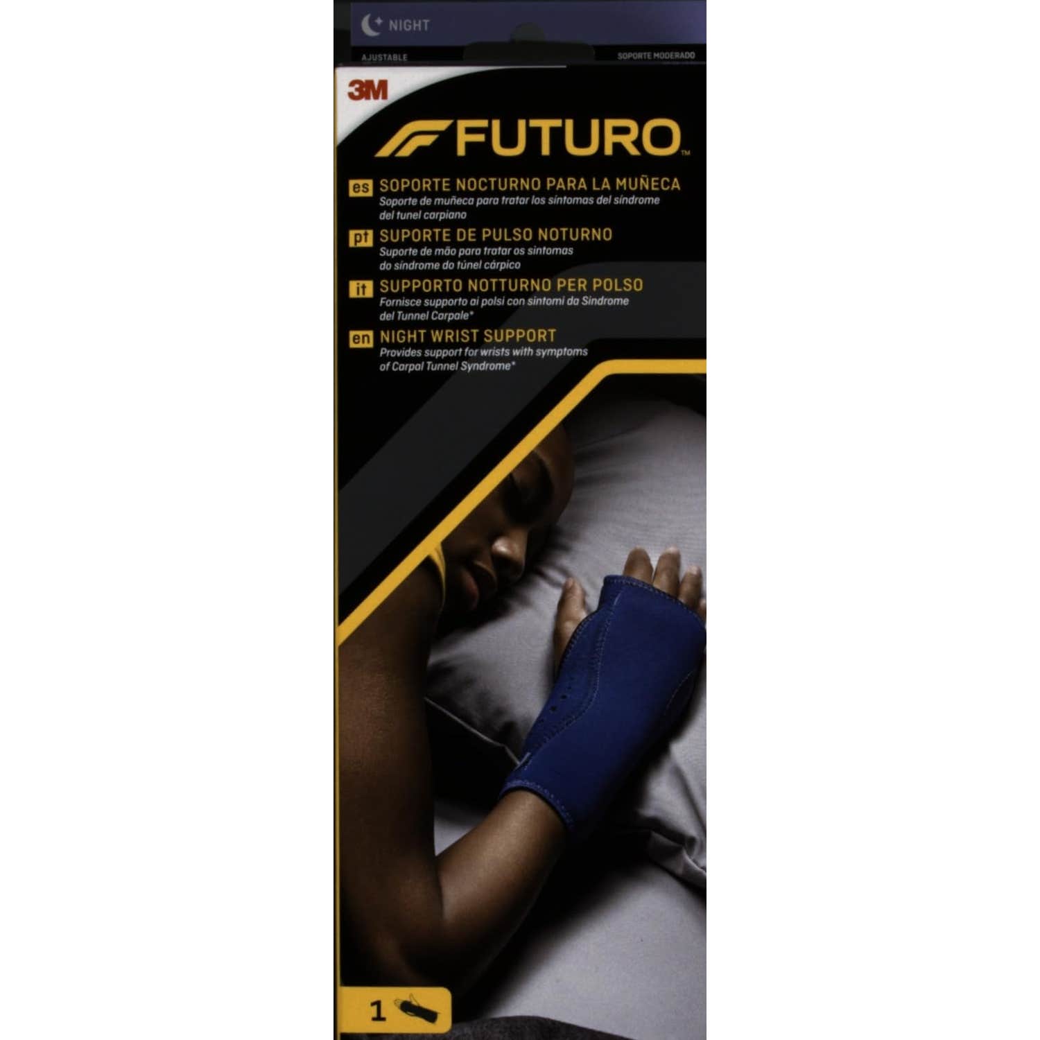 La muñequera con soporte nocturno para el tunel carpiano de Futuro™ alivia el dolor y recupera el confort gracias a su almohadilla palmar y estabilizador ajustable que inmoviliza la muñeca y promueven la posición ideal de la mano para una recuperación eficaz e intensa.