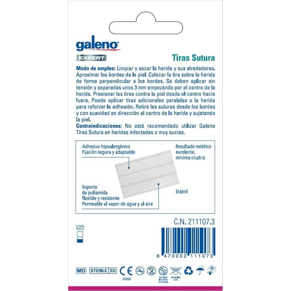 Galeno Tiras Sutura 2 Tamaños 14 uds para cierre de heridas menores son tiras adhesivas para unir los bordes de cortes superficiales y abrasiones de forma segura. Incluyen 14 unidades en dos tamaños, pequeño y grande, como alternativa práctica y menos invasiva a las suturas tradicionales.