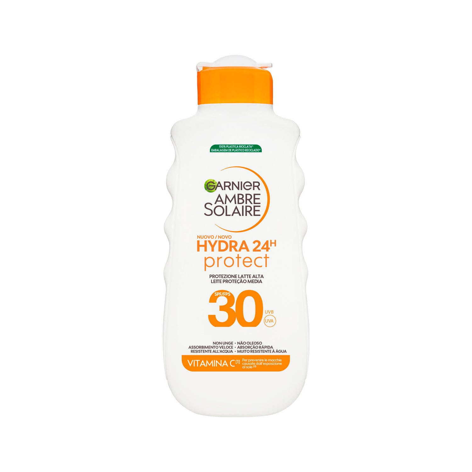 Garnier Ambre Solaire Hydra 24H Protect Leite Protetor SPF30 es un protector solar de alta eficacia, que proporciona una protección muy alta con un factor de protección solar de 30. Este producto defiende tu piel de los daños causados por los rayos UVA y UVB.