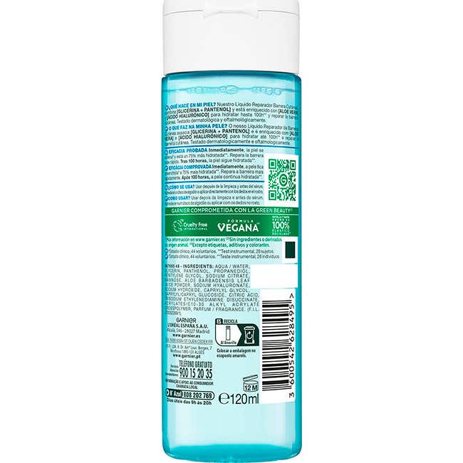 Garnier Hyaluron Líquido Reparador Barrera Cutánea es un producto diseñado para proporcionar una intensa hidratación. Este líquido cuenta con una combinación del 12% de glicerina y pantenol, reforzado con aloe vera y ácido hialurónico, ofreciendo hasta 100 horas de hidratación y restaurando la barrera cutánea.
