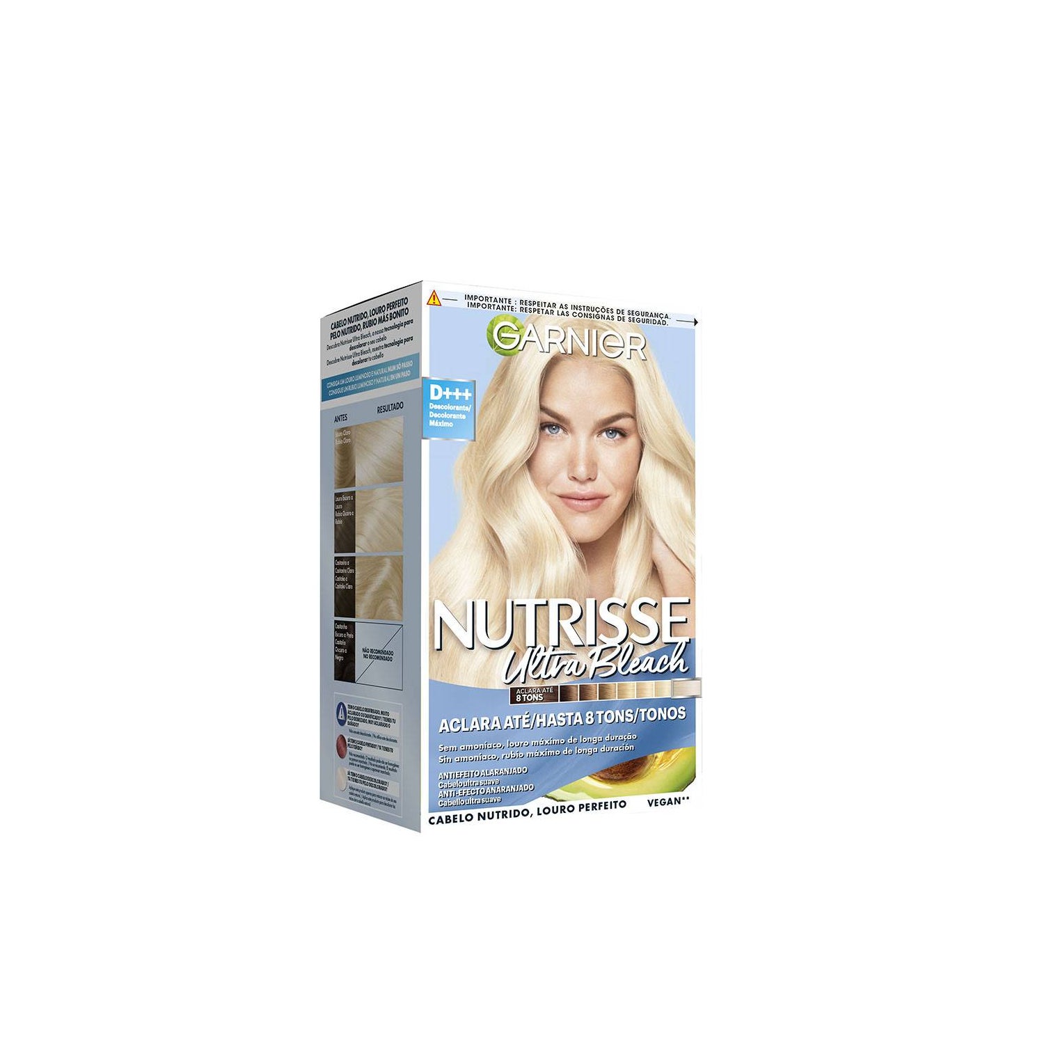 Garnier Kit Nutrisse Ultra Bleach D+++ Descolorante Máximo es un producto diseñado para lograr una decoloración intensa. Este kit incluye una fórmula que no solo se centra en aclarar el cabello, sino que también proporciona nutrición profunda gracias a su enriquecimiento con cinco aceites en el tratamiento reparador.