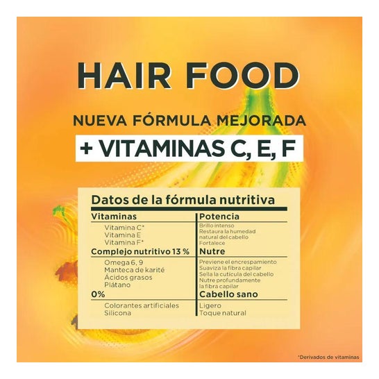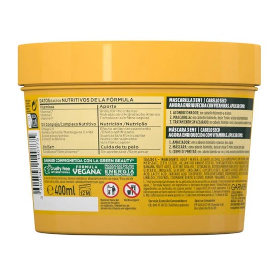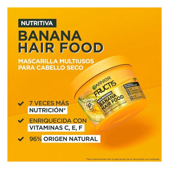 La mascarilla Fructis Hair Food Banana de Garnier está diseñada para fortalecer el pelo. La banana contiene un alto contenido de minerales, vitaminas A, C y E, zinc y potasio. Esta combinación de ingredientes es la clave para brindarle una alta hidratación, brillo y fuerza al pelo. Su fórmula es biodegradable en un 98%. Es un tratamiento capilar vegano que no contiene colorantes artificiales, parabenos ni siliconas.