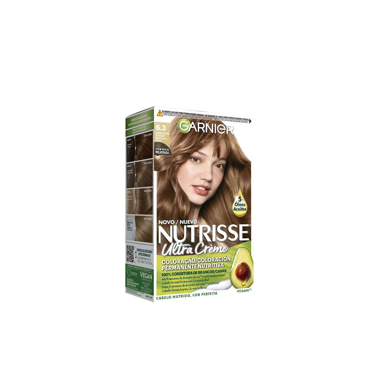 Garnier Nutrisse Kit Coloração Permanen 6.3 Louro Escuro Dourado es una solución diseñada para ofrecer un color intenso y duradero. Este producto se distingue por su capacidad para nutrir el cabello mientras lo colorea, gracias a su fórmula enriquecida con cinco aceites en su tratamiento reparador.