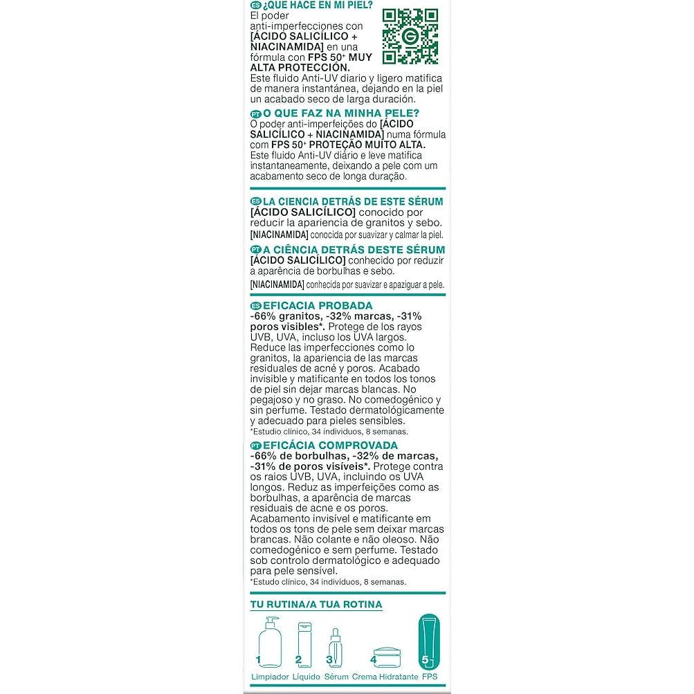 Garnier Pure Active BHA + Niacinamida Spf50+ 40ml es un fluido anti imperfecciones diseñado para proteger la piel del rostro del sol.