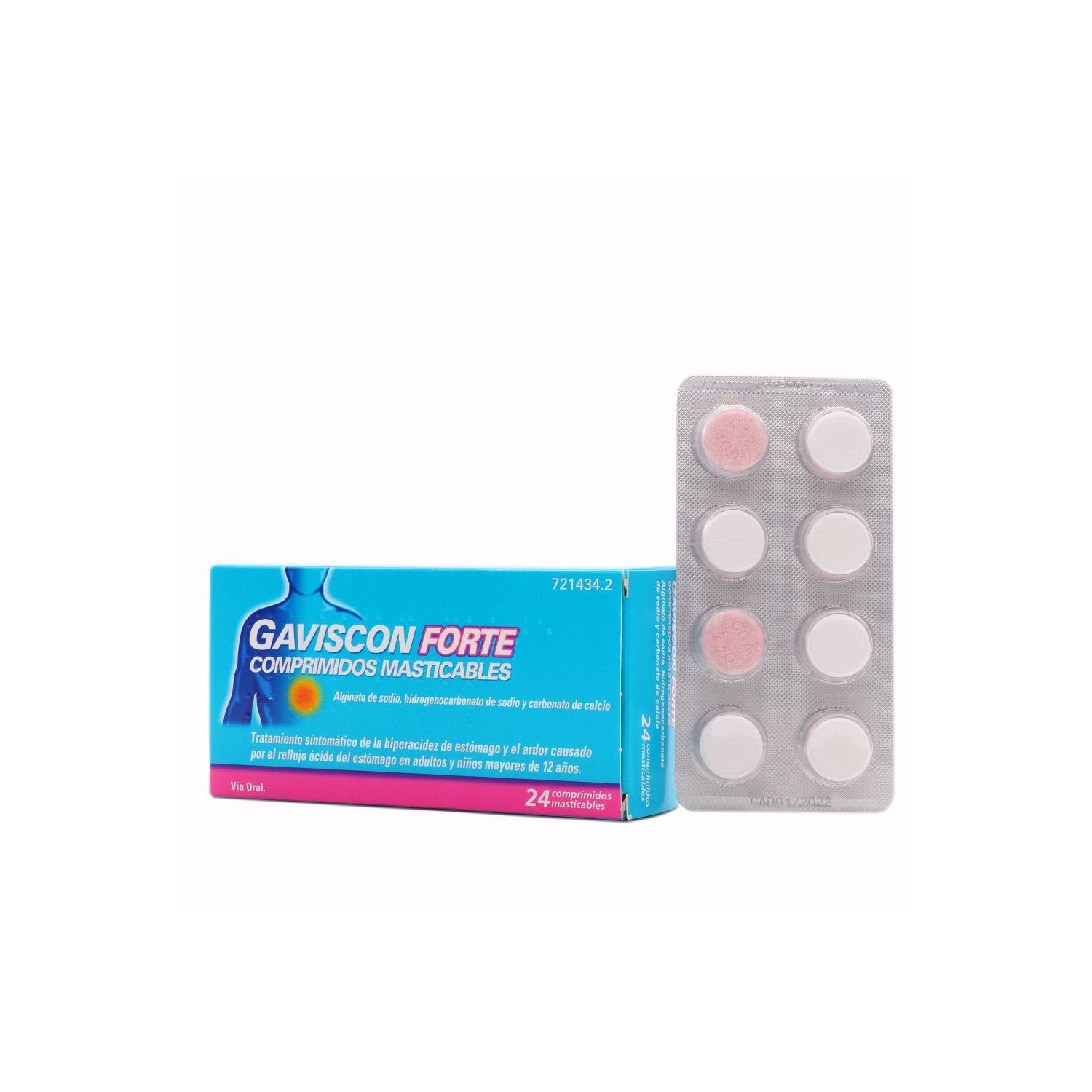 Evitar el uso prolongado porque incrementa el riesgo de desarrollar cálculos renales. Se debe tener en cuenta que cada dosis de cuatro comprimidos contiene 300 mg (7,5 mmol) de calcio. La administración de dosis altas durante periodos largos de tiempo puede producir efectos indeseables hipercalcemia, nefrocalcinosis, desarrollo de cálculos renales y síndrome de leche alcalino, especialmente en pacientes con insuficiencia renal. El medicamento no se debe administrar con grandes cantidades de leche o productos lácticos. Si los síntomas persisten o sólo se alivian parcialmente tras 7 dias de tratamiento, se deberá evaluar la situación clínica. Este medicamento se debe administrar con precaución en los siguientes casos: Pacientes con alteraciones de la función renal leve o moderada. Si se administra a pacientes con alteración de la función renal, los niveles plasmáticos de calcio, fosfato y magnesio se deberían monitorizar regularmente. Pacientes con estreñimiento, hemorroides y sarcoidosis. En la literatura se han descrito casos aislados de una posible relación entre el carbonato de calcio, apendicitis, hemorragia gastrointestinal, obstrucción intestinal, o edema. Este medicamento contiene 223,56 mg de sodio por dosis (4 comprimidos), equivalente al 11,2 % de la ingesta de sodio máxima recomendada por la OMS. La dosis máxima diaria de este medicamento es equivalente al 44,7 % de la ingesta máxima diaria recomendada por la OMS para el sodio. Gaviscon Forte tiene un elevado contenido en sodio. Por lo que debe tenerse en cuenta en pacientes con dietas bajas en sodio. Este medicamento contiene 23,44 mg de aspartamo en cada 4 comprimidos. El aspartamo contiene una fuente de fenilalanina que puede ser perjudicial en caso de padecer fenilcetonuria (FCN). No hay datos clínicos o preclínicos disponibles que permitan evaluar el uso de aspartamo en lactantes por debajo de 12 semanas de edad. Puede producir un efecto laxante porque contiene manitol. Este medicamento puede producir reacciones alérgicas porque contiene azorubina (E-122). Puede provocar asma, especialmente en pacientes alérgicos al ácido acetilsalicílico.